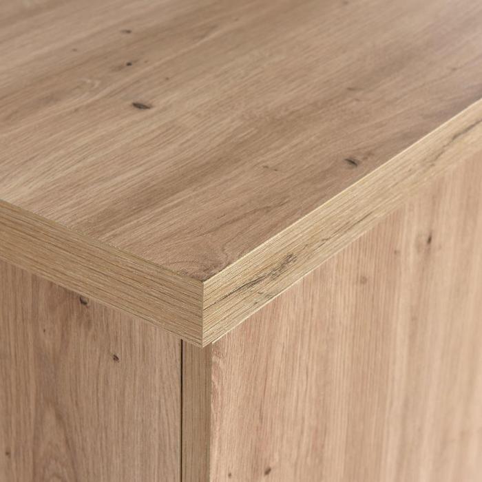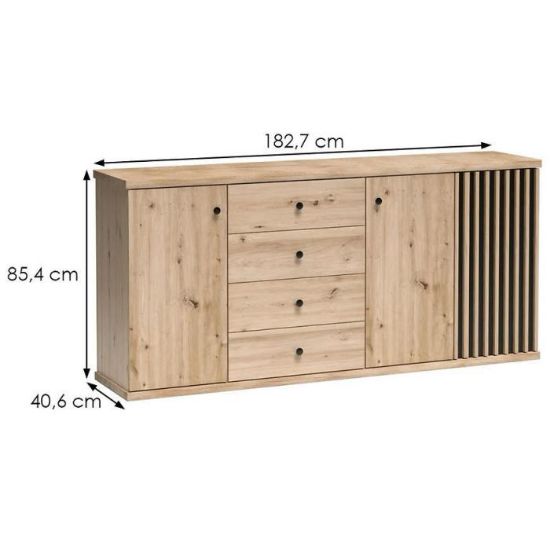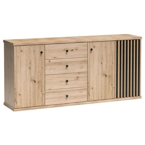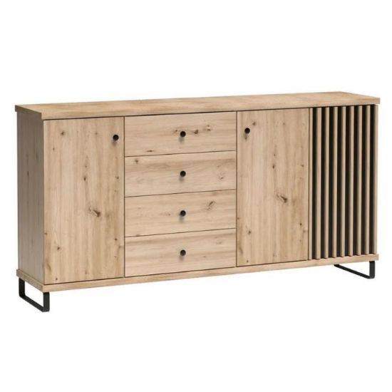 Komoda Cali w kolorze dąb artisan to przede wszystkim nowoczesność i funkcjonalność w jednym. Mebel doskonale sprawdzi się w każdym salonie. Materiał wykonania to płyta wiórowa laminowana. Komoda posiada trzy szafki i cztery szuflady dzięki czemu ma łatwy dostęp do wnętrza. Wygląd mebli jest nowoczesny, a zarazem uniwersalny. Mebel będzie pasował do wielu pomieszczeń jak np. jadalni czy pokoju dziennego. Meble jest bardzo pojemny, dlatego sprawdzi się w każdym pomieszczeniu - zarówno w sypialni, pokoju dziennym, młodzieżowym, czy też salonie. Mebel do samodzielnego montażu.