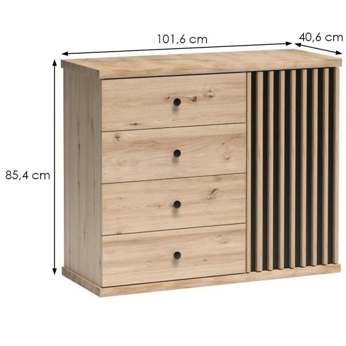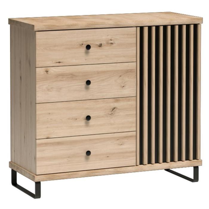 Komoda Cali będzie pasowała do pokoju dziennego lub sypialni. Kolor mebla dąb artisan wpasuje się w wiele aranżacji w nowoczesnych wnętrzach jak również we wnętrzach klasycznych. Szafka posiada szuflady i drzwiczki dzięki czemu ma łatwy dostęp do wnętrza oraz odpowiednią przestrzeń do przechowywania odzieży lub innych przedmiotów. Płyta laminowana to płyta, z której wykonano komodę. Do kompletu można dokupić inne meble z kolekcji.