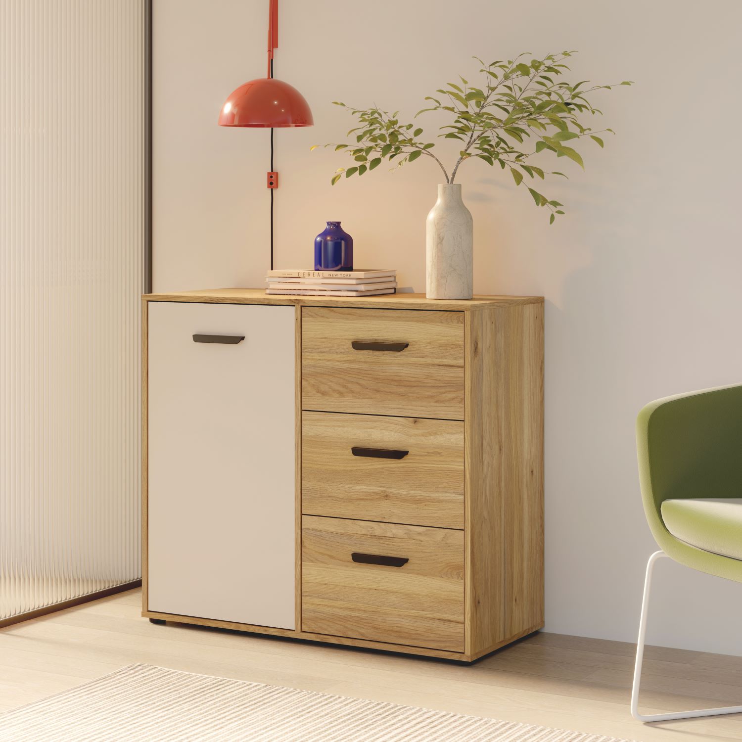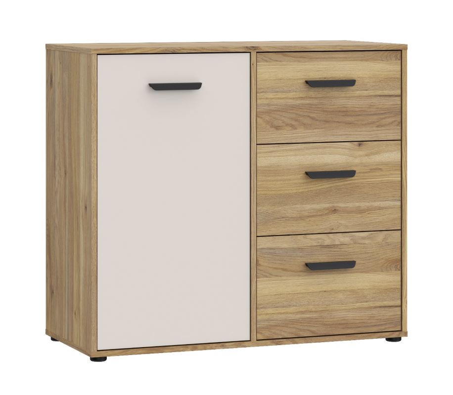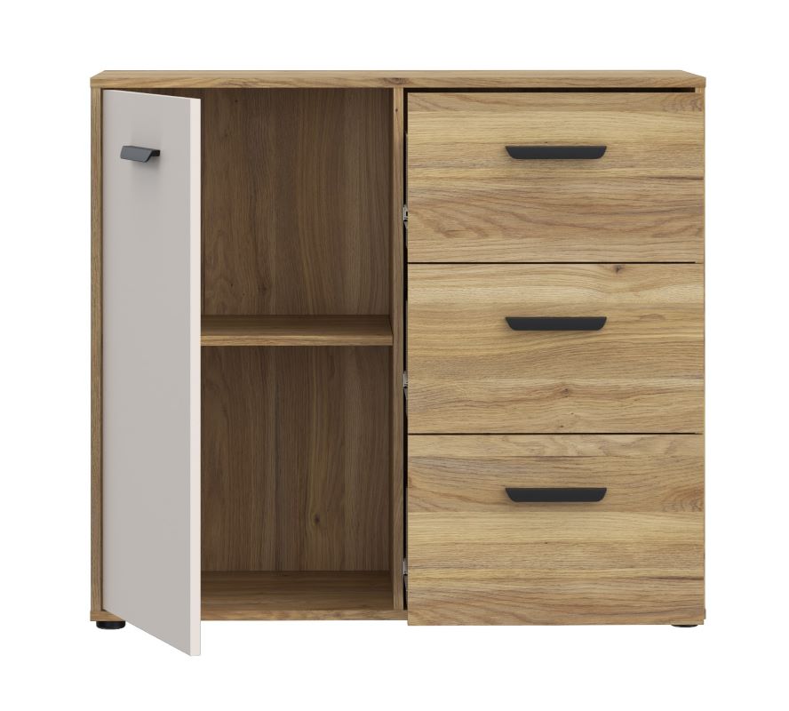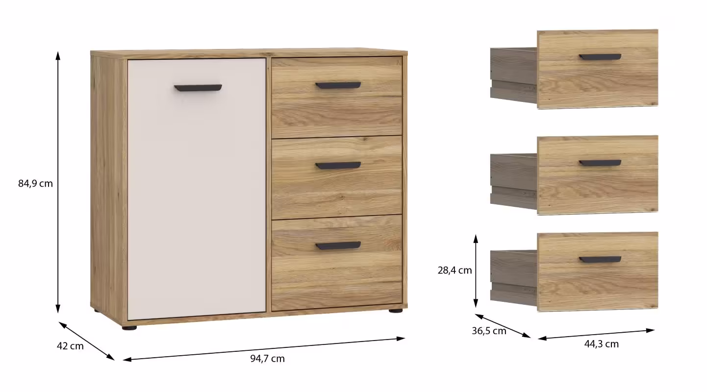 Komoda wyposażona jest w jedne drzwi oraz trzy pojemne szuflady, co zapewnia wygodną i zróżnicowaną przestrzeń do przechowywania. Drzwi ukrywają przestronną półkę, idealną na większe przedmioty, podczas gdy szuflady pomogą w uporządkowaniu drobniejszych akcesoriów, ubrań czy dokumentów. Praktyczne rozmieszczenie elementów sprawia, że komoda jest nie tylko estetyczna, ale również niezwykle funkcjonalna.
