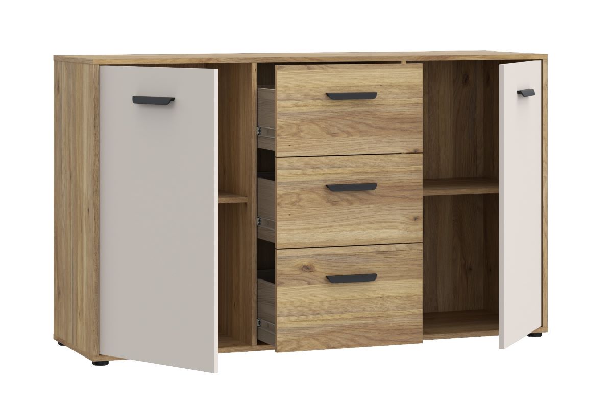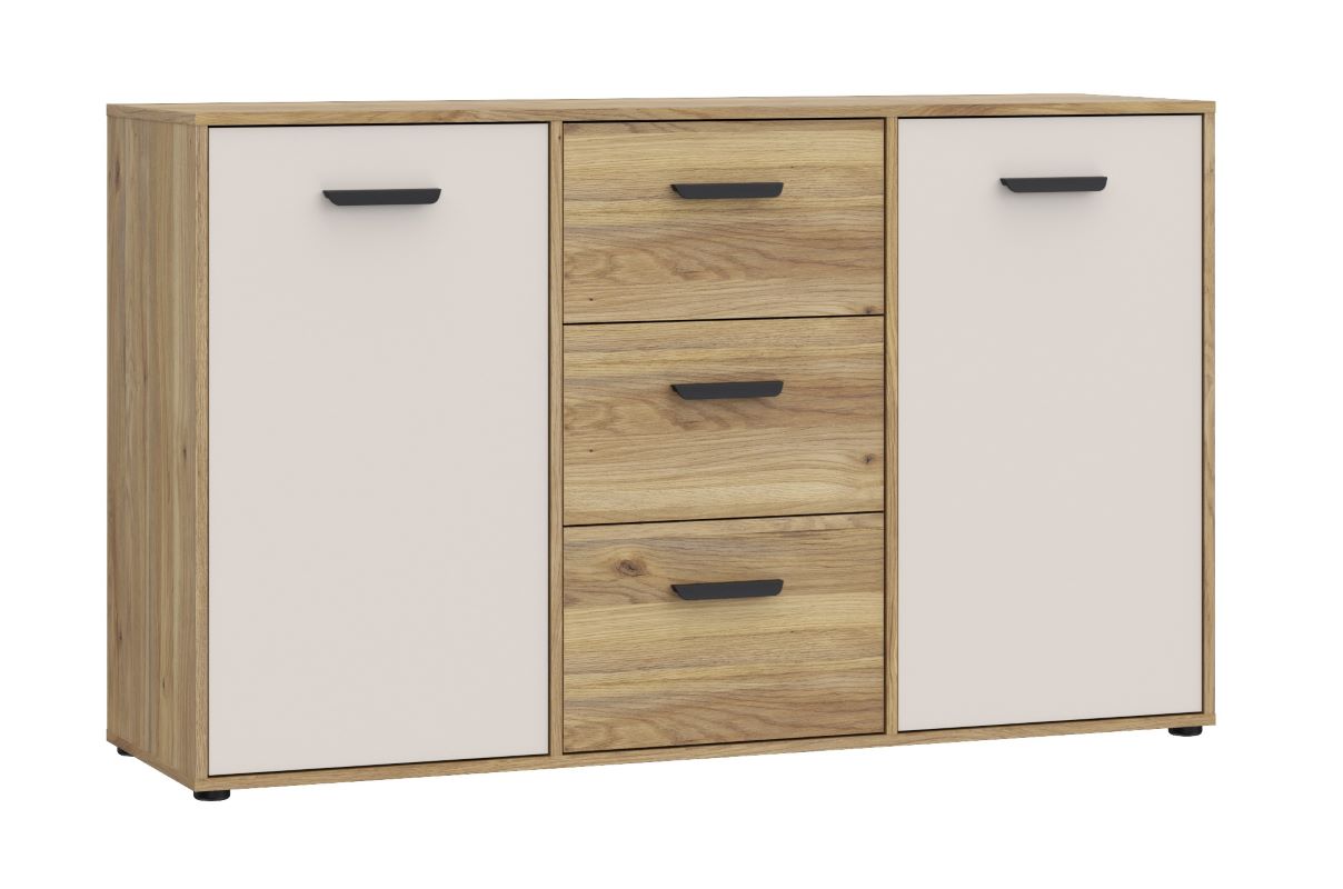 Komoda Calvado 231 to elegancki mebel, który łączy funkcjonalność z nowoczesnym designem. Wykonana w harmonijnym połączeniu dekoru dąb mauvella i piaskowego frontu, wprowadza do wnętrza ciepło oraz naturalny, przytulny charakter. Dzięki uniwersalnej stylistyce komoda doskonale sprawdzi się w sypialni, salonie, przedpokoju lub jadalni.