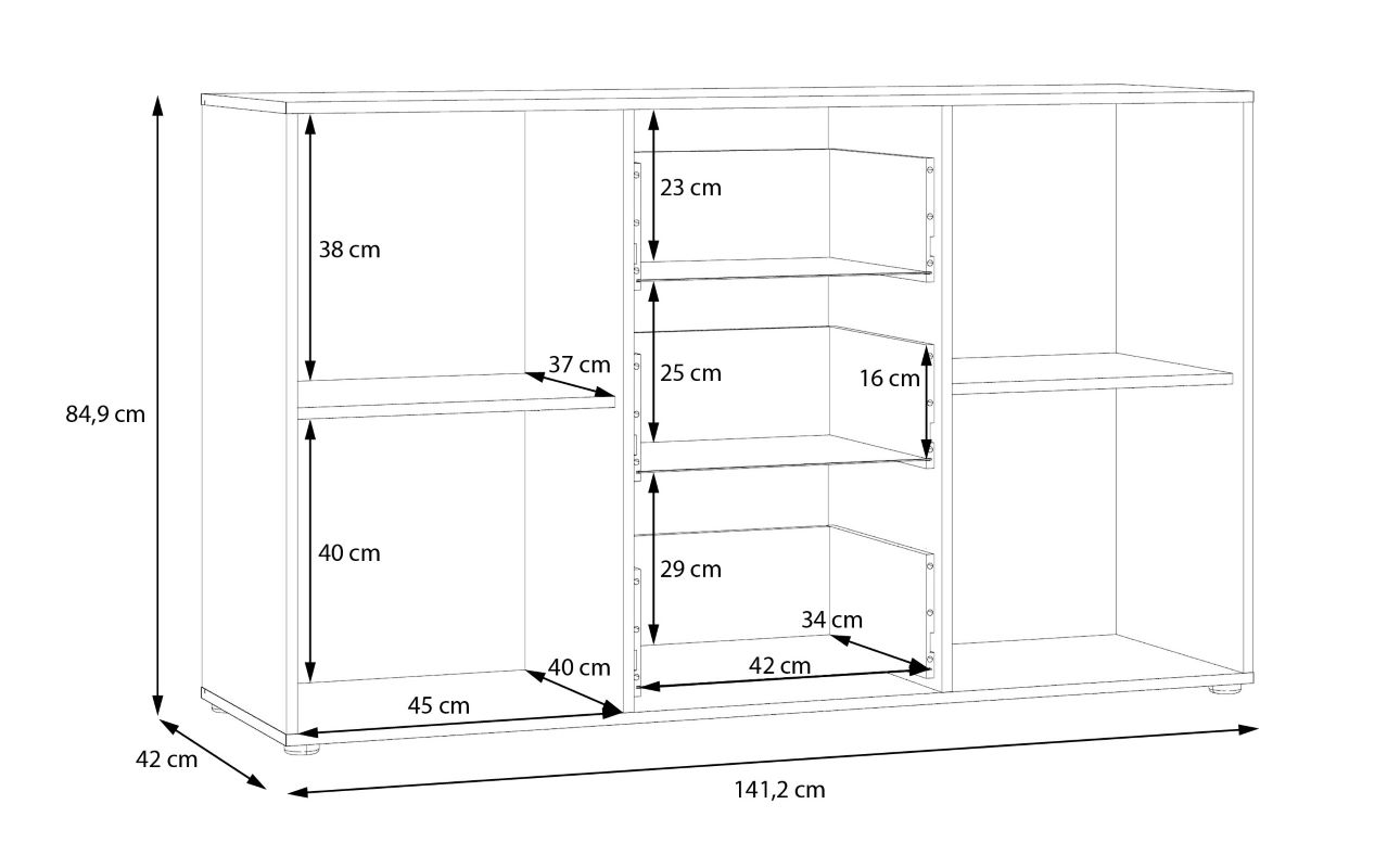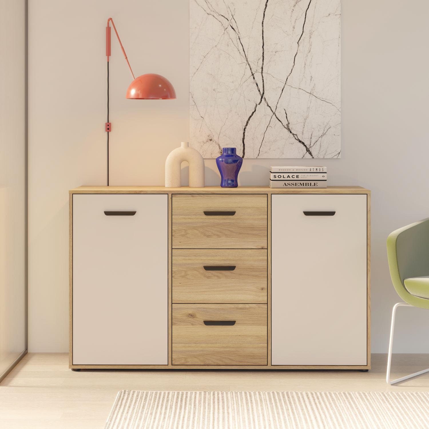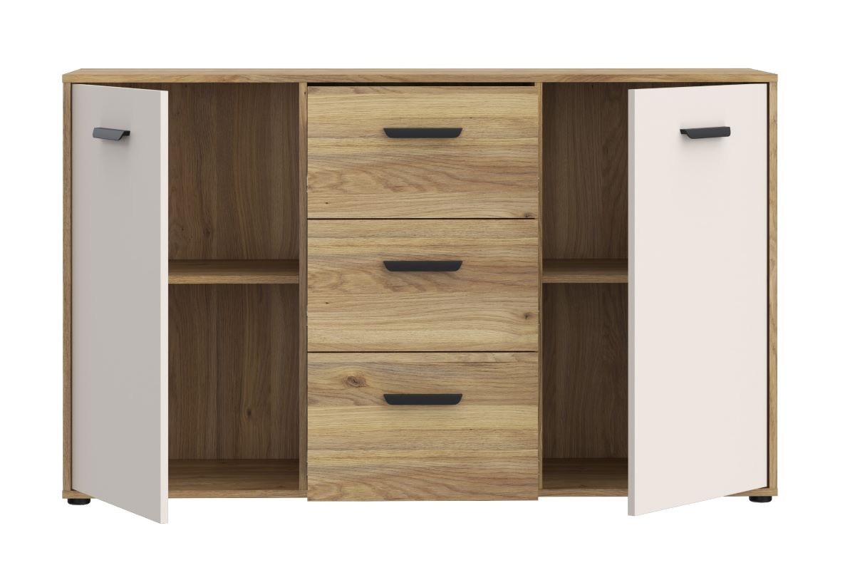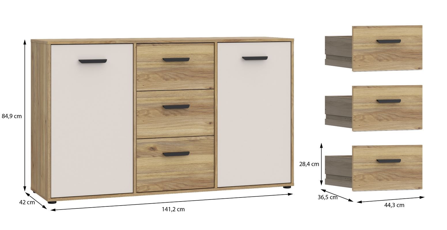 Komoda dwudrzwiowa wyposażona jest w trzy pojemne szuflady, co zapewnia wygodną i zróżnicowaną przestrzeń do przechowywania. Drzwi ukrywają półki, idealne na większe przedmioty, podczas gdy szuflady pomogą w uporządkowaniu drobniejszych akcesoriów, ubrań czy dokumentów. Praktyczne rozmieszczenie elementów sprawia, że komoda jest nie tylko estetyczna, ale również niezwykle funkcjonalna.