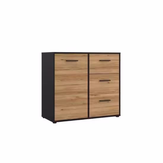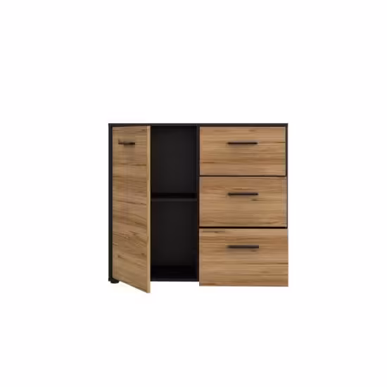 Komoda Calvado MOKK221L w kolorze dąb catania z czarnym korpusem to funkcjonalny i stylowy mebel, który łączy nowoczesny design z praktycznym zastosowaniem. W całości wykonana z płyty meblowej, zarówno fronty, jak i korpus posiadają matowe wykończenie, nadając komodzie elegancki i ponadczasowy charakter. Model wyposażono w jedno drzwiowe fronty oraz trzy pojemne szuflady, które zapewniają wygodne miejsce do przechowywania odzieży, akcesoriów i innych przedmiotów, umożliwiając utrzymanie porządku w pomieszczeniu.