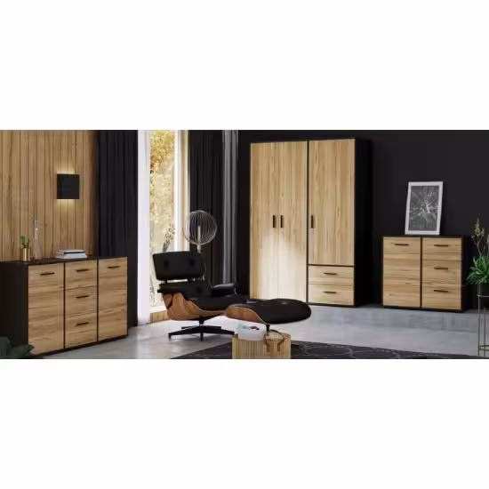 Komoda Calvado MOKK221L to idealny wybór dla osób ceniących nowoczesny wygląd połączony z funkcjonalnością. Pojemne szuflady i drzwi sprawiają, że mebel doskonale nadaje się do przechowywania różnorodnych przedmiotów, a eleganckie zestawienie wybarwienia dąb catania z czarnym korpusem wprowadza do wnętrza przytulny i harmonijny klimat, który pasuje zarówno do nowoczesnych, jak i klasycznych aranżacji wnętrz.