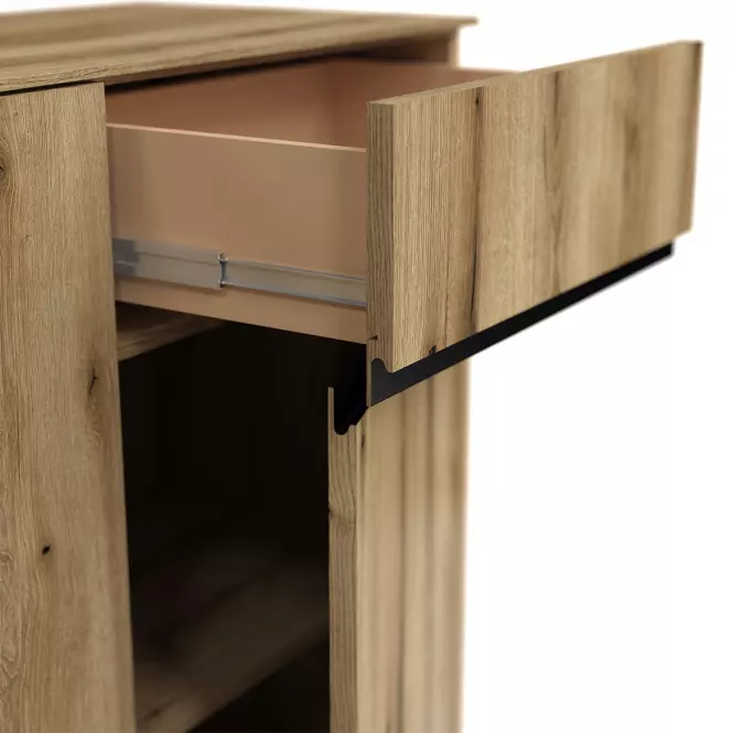 Jednolity kolor dębu evoke: Komoda utrzymana jest w subtelnym, naturalnym odcieniu dębu evoke, zarówno na frontach, jak i na korpusie. Taki wybór kolorystyczny idealnie komponuje się z różnymi stylami wnętrz, od minimalistycznych po bardziej klasyczne. Jasne, drewnopodobne wybarwienie dodaje wnętrzom przytulności, a jednocześnie podkreśla ich nowoczesny charakter.