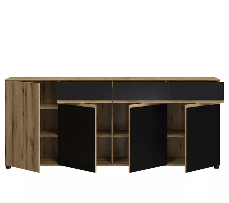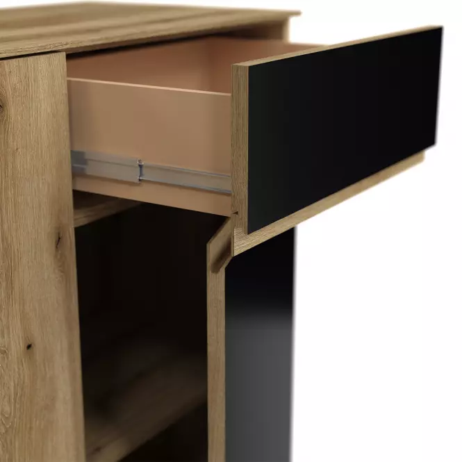 Kontrastowe połączenie kolorów: Komoda zachwyca swoją harmonią pomiędzy naturalnym odcieniem dębu evoke a wyrazistą, matową czernią aksamitną na frontach. To połączenie kolorów nadaje meblowi wyjątkowego charakteru, idealnie sprawdzając się zarówno w nowoczesnych, jak i loftowych wnętrzach.