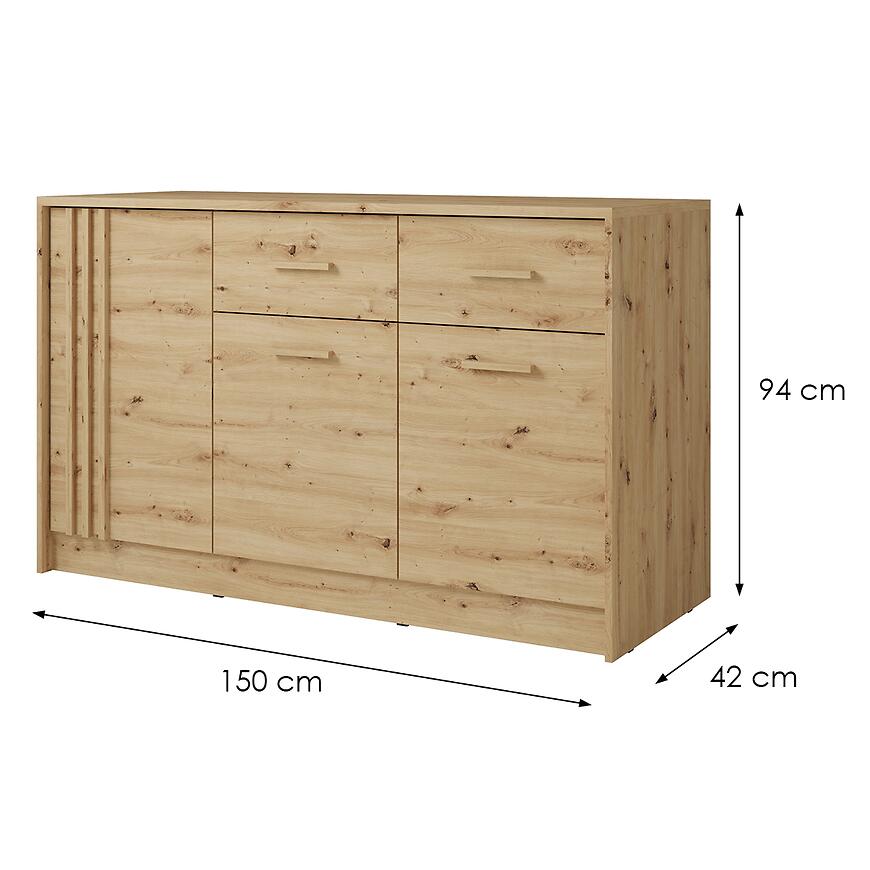 Szerokość 150 cm zapewnia dużą przestrzeń do przechowywania, dzięki czemu komoda wyróżnia się wysoką funkcjonalnością przy zachowaniu estetycznej bryły.