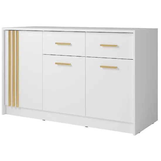 Komoda Canada CD-25 łączy dużą pojemność z eleganckim wyglądem. Jasna biel i złote detale tworzą harmonijną całość, a przemyślany układ przechowywania wspiera codzienną organizację przestrzeni.