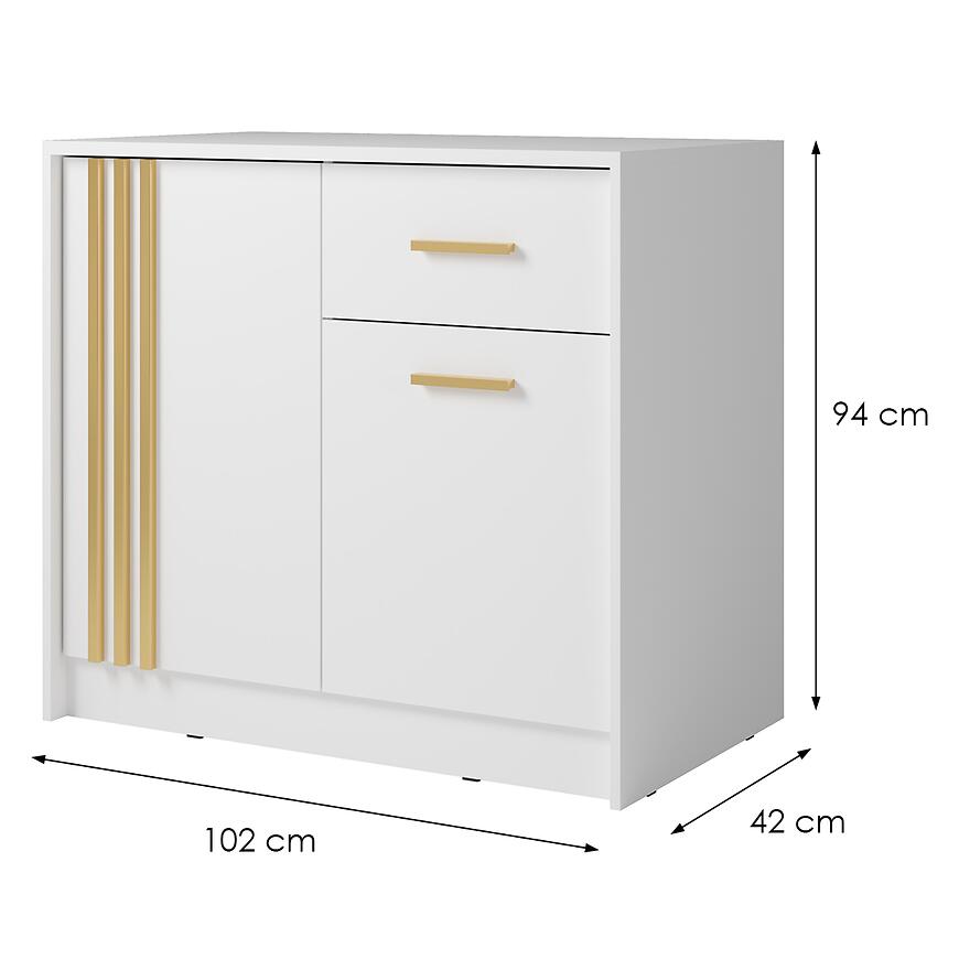Dzięki wymiarom 102 cm szerokości, 94 cm wysokości i 42 cm głębokości komoda oferuje wygodną przestrzeń do przechowywania, zachowując jednocześnie kompaktową formę.