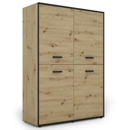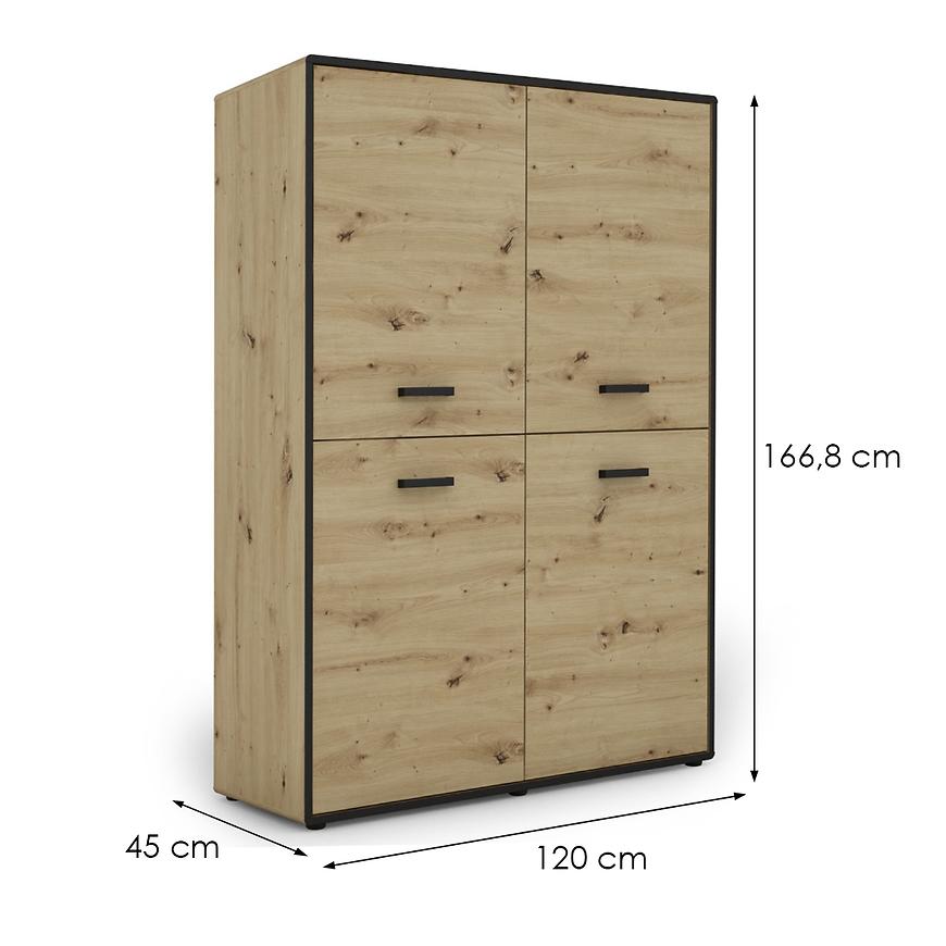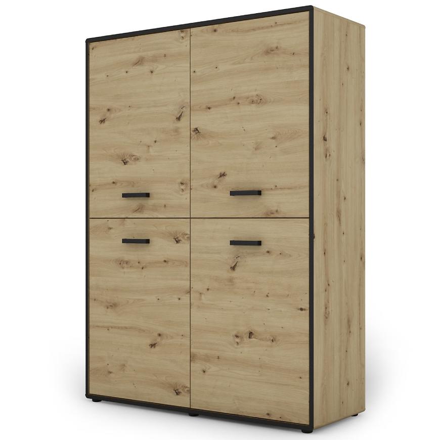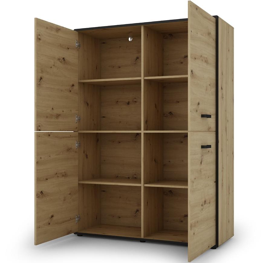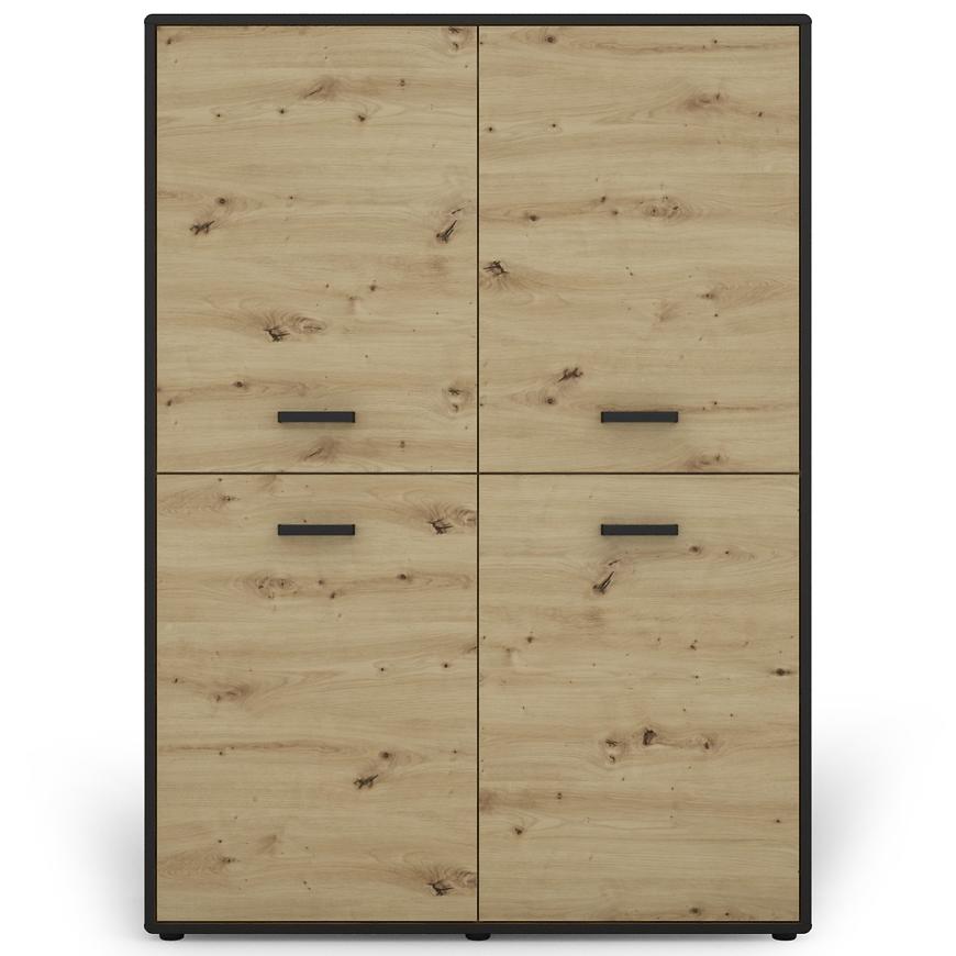 Styl nowoczesny, charakteryzujący się prostymi liniami i minimalistycznym wyglądem, stanowi filar tej komody. Jej forma doskonale wpisuje się w różnorodne aranżacje przestrzeni, dodając im nutę współczesnego szyku. Kolor dąb artisan/czarny to eleganckie połączenie ciepłego odcienia drewna z głęboką czernią, tworząc kontrast, który zarazem przyciąga uwagę i harmonijnie komponuje się z otoczeniem.