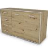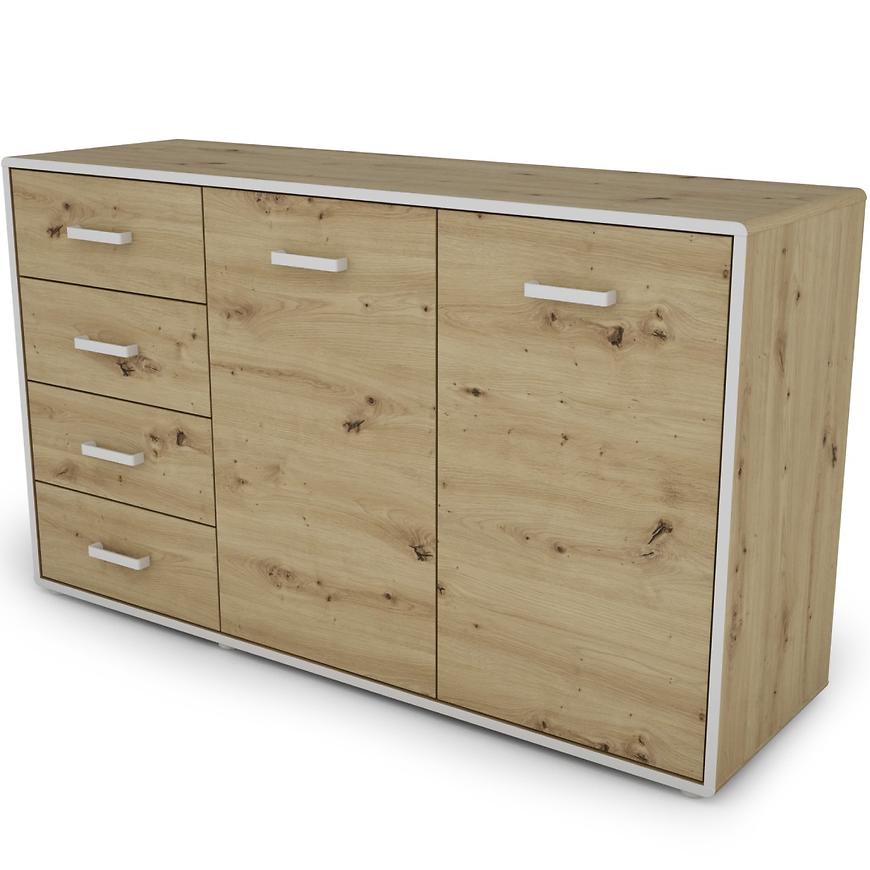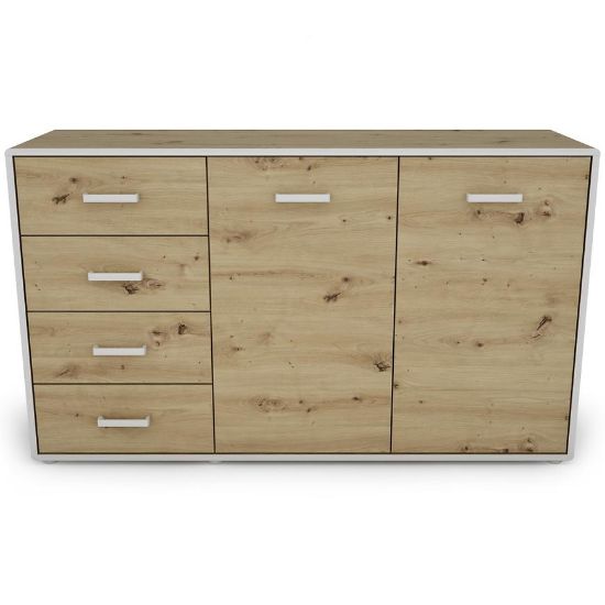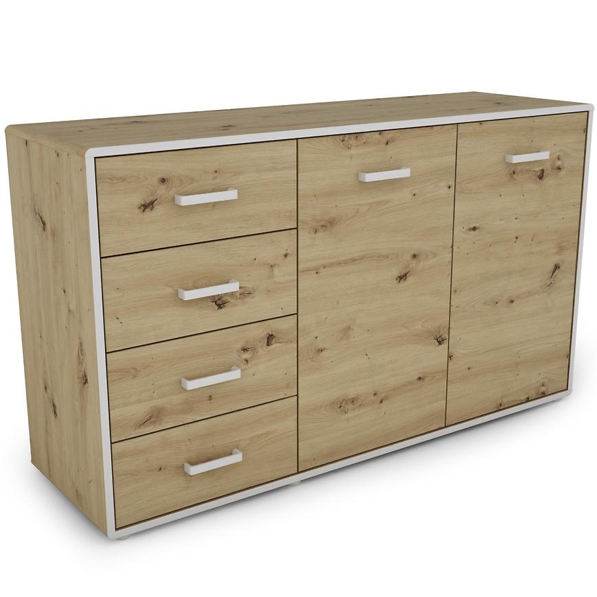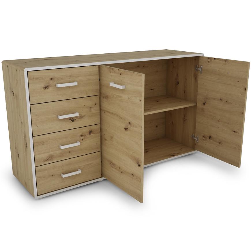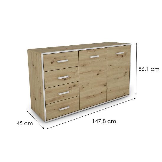 Styl nowoczesny, który emanuje z każdego elementu tej komody, wprowadzi świeży i minimalistyczny akcent do Twojego wnętrza. Jej prosta, geometryczna forma w połączeniu z eleganckim wykończeniem dębu artisan i bieli nadaje meblowi niepowtarzalny charakter. To wyważone zestawienie kolorów i kształtów tworzy kompozycję, która przyciąga uwagę i doskonale komponuje się z nowoczesnym wystrojem wnętrza.
