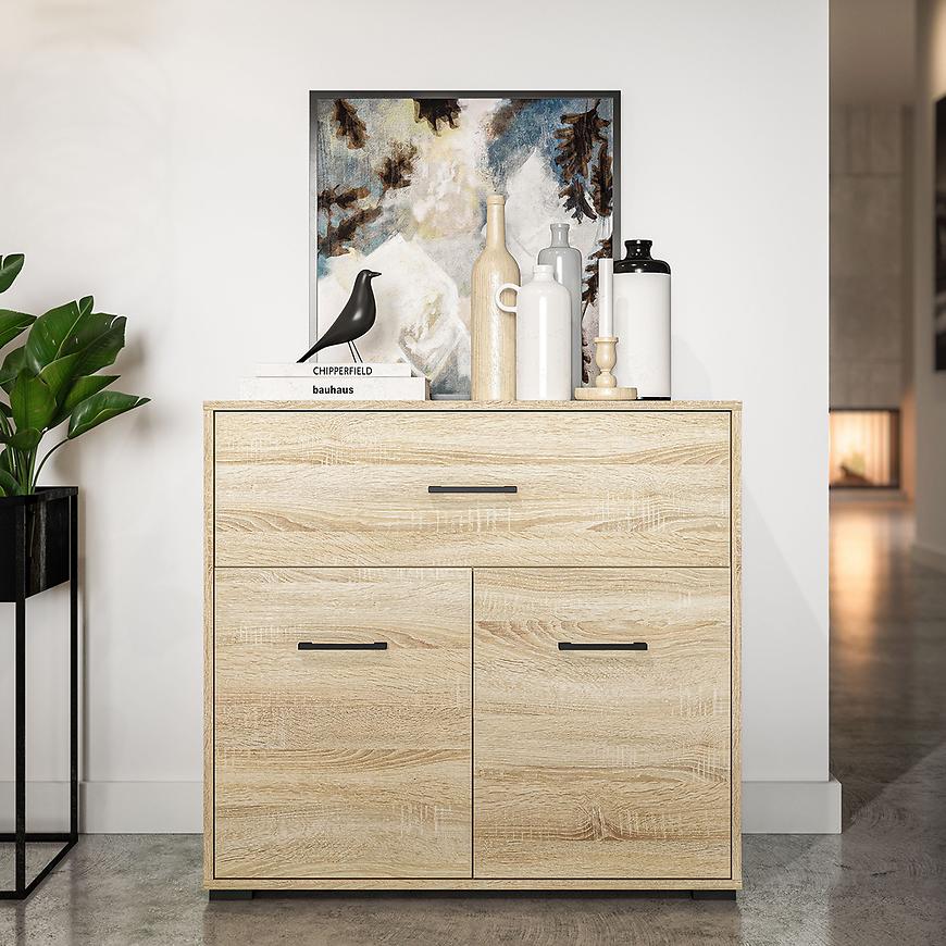 Wybarwienie dąb sonoma nadaje komodzie Caro 23 naturalny i przyjemny wygląd. Ten ciepły odcień drewna dodaje wnętrzu uroku i harmonii. Czarne uchwyty kontrastują z delikatnym kolorem dębu, nadając komodzie nowoczesnego charakteru.