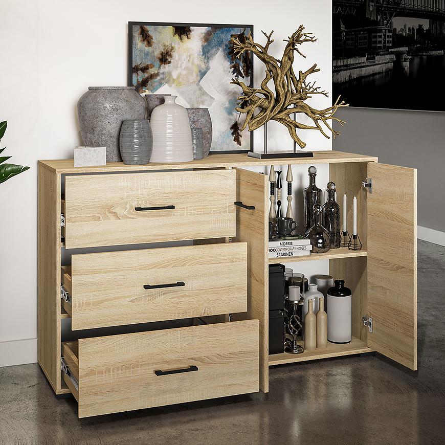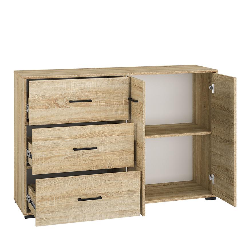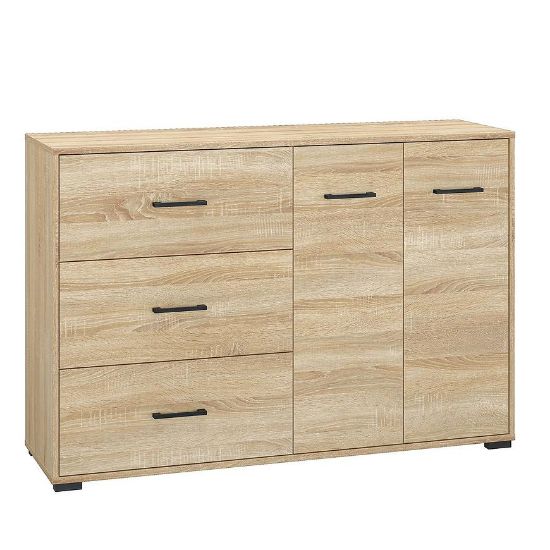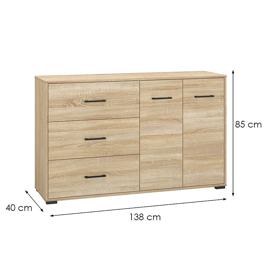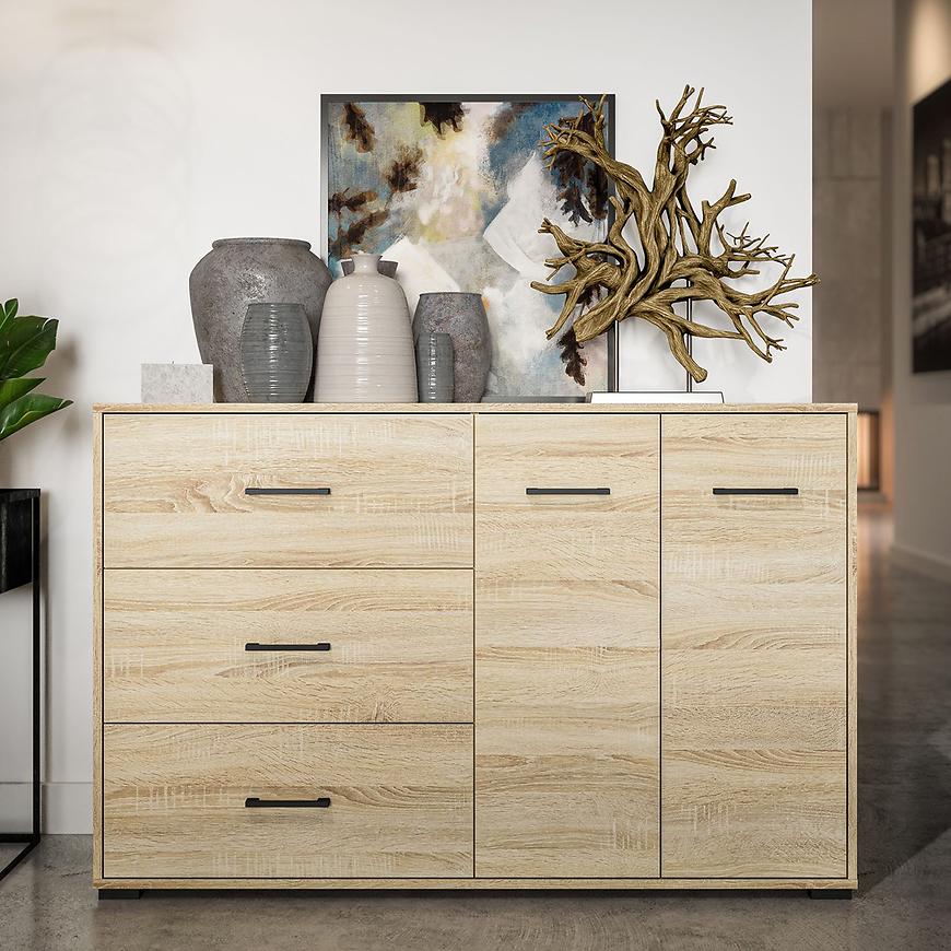 Komoda Caro 25 w wybarwieniu dąb sonoma to niezastąpiony mebel, który doskonale połączą funkcjonalność z estetyką. Ta pojemna komoda została zaprojektowana, aby zapewnić maksymalne wykorzystanie przestrzeni i ułatwić organizację przechowywanych przedmiotów. Trzy otwierane szuflady komody Caro 25 oferują dodatkowe miejsce do przechowywania drobnych przedmiotów. Dzięki nim możesz uporządkować bieliznę, dokumenty czy różnego rodzaju akcesoria, mając je zawsze pod ręką. To praktyczne rozwiązanie pomaga utrzymać porządek w Twoim otoczeniu.