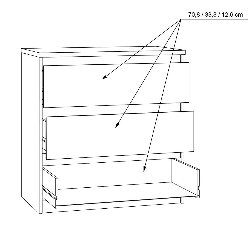 Dzięki solidnej konstrukcji z płyty wiórowej laminowanej, komoda jest trwała i odporna na uszkodzenia. Dodatkowo, matowe wykończenie zarówno frontów, jak i korpusu nadaje jej wyjątkowej elegancji i są bardzo praktyczne w codziennym użytkowaniu.