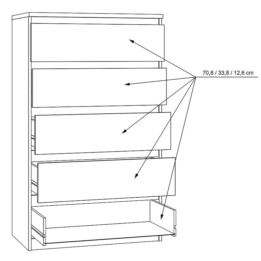Dzięki solidnej konstrukcji z płyty wiórowej laminowanej, komoda jest trwała i odporna na uszkodzenia. Dodatkowo, matowe wykończenie zarówno frontów, jak i korpusu nadaje jej wyjątkowej elegancji i są bardzo praktyczne w codziennym użytkowaniu.