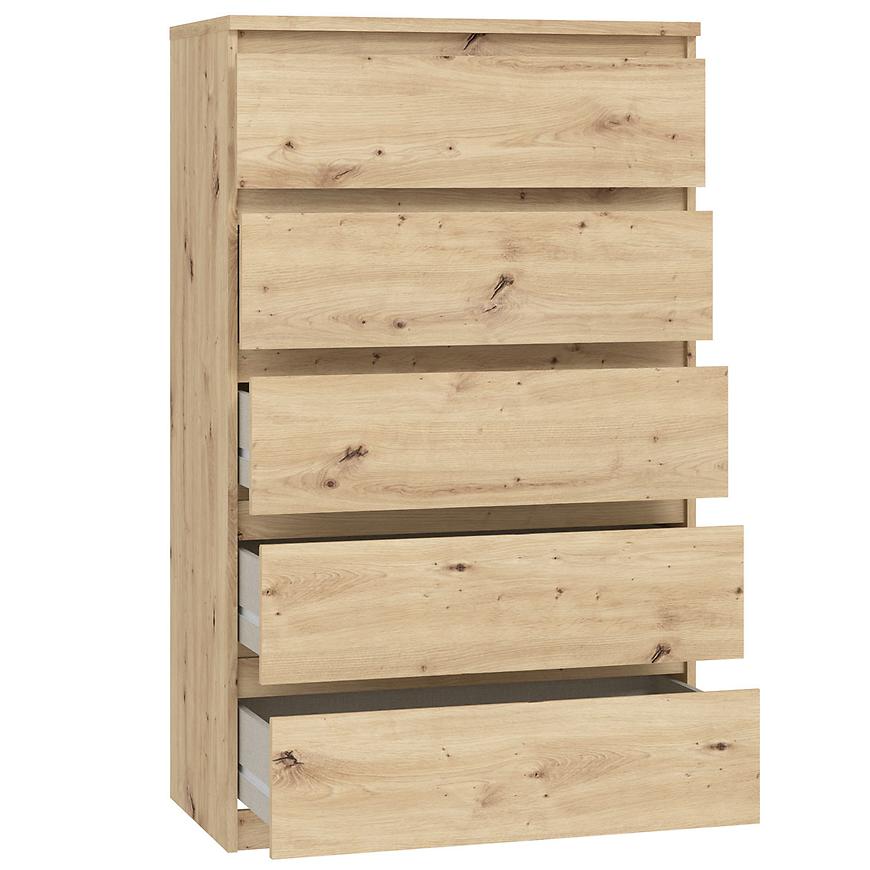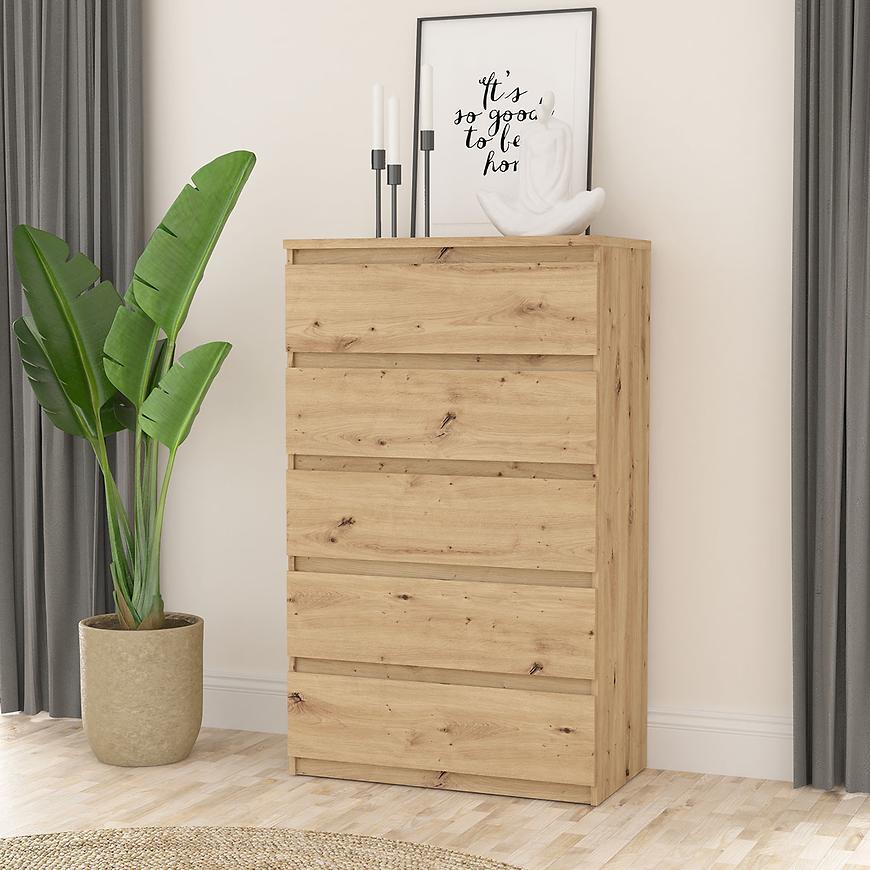 Komoda CHELSEA to nie tylko praktyczny mebel do przechowywania, ale także wyrafinowana ozdoba Twojego wnętrza. Jej jasne drewnopodobne wybarwienie w połączeniu z eleganckim dębowym kolorem frontów nadaje jej unikalnego charakteru. Pojemne szuflady pozwalają na uporządkowanie różnych przedmiotów, zachowując przy tym estetyczny porządek w Twoim domu.