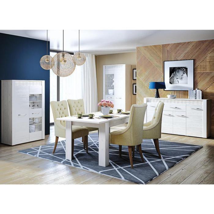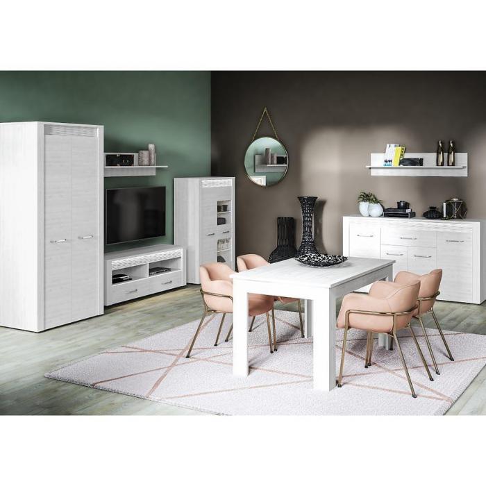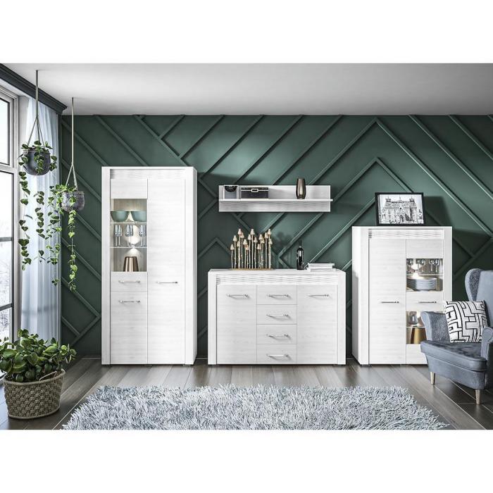 Komoda Clermont to mebel idealny do pokoju dziennego lub salonu. Meble posiadają podświetlaną, ryflowaną wstawkę MDF. W zestawie znajduja się metalowe, chromowane uchwyty. Wzór jasnego drewna rozjaśni wnętrze, nadając przy tym elegancji. Kolekcja Clermont wpasuje się w wiele aranżacji w nowoczesnych wnętrzach jak również we wnętrzach klasycznych. Szafka posiada drzwiczki dzięki czemu ma łatwy dostęp do wnętrza oraz odpowiednią przestrzeń do przechowywania odzieży lub innych przedmiotów. Płyta laminowana to płyta, z której wykonano komodę. Do kompletu można dokupić inne meble z kolekcji.