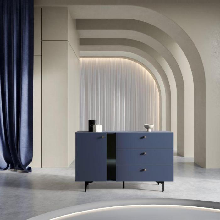 Komoda wyróżnia się oryginalnym designem. Wyrazisty odcień ciemnego błękitu ciekawie komponuje się z detalami o barwie połyskującej czerni. Nowoczesny styl mebla to również zasługa modnych, smukłych nóżek oraz niewielkich uchwytów o barwie złota. Warto zwrócić uwagę na nietypowo zaokrąglone krawędzie frontów, które podkreślają niebanalny styl komody. Mebel wykonano z wytrzymałej płyty laminowanej, obrzeża wykończono ABS. Drzwi wyposażono w system soft close. Komoda jest również dostępna w kolorze szałwiowym.