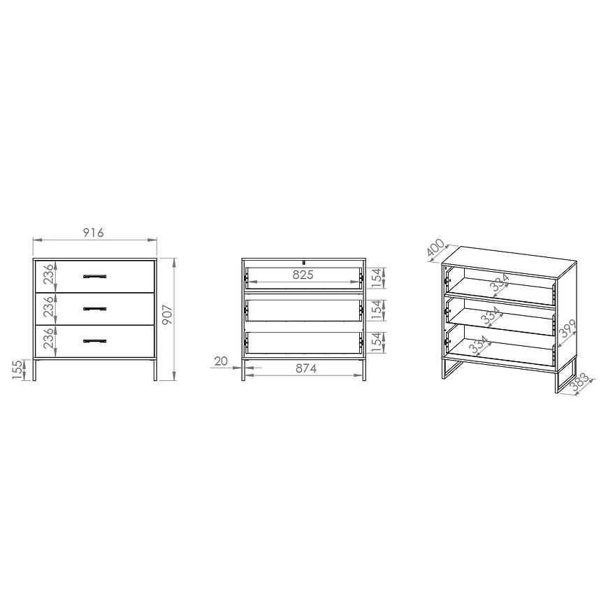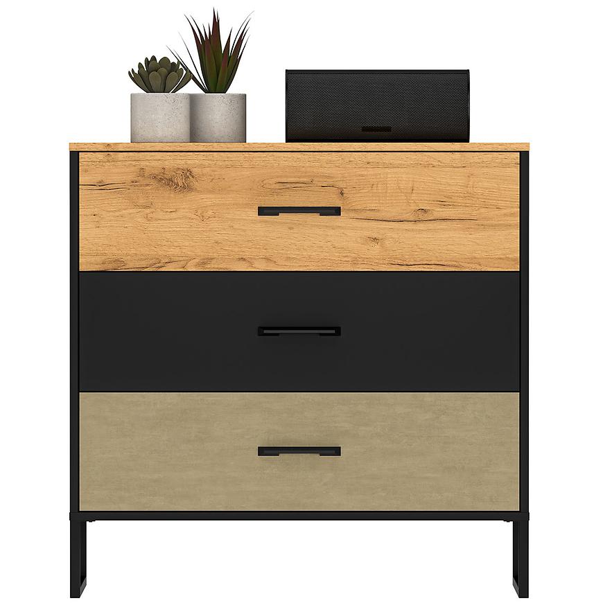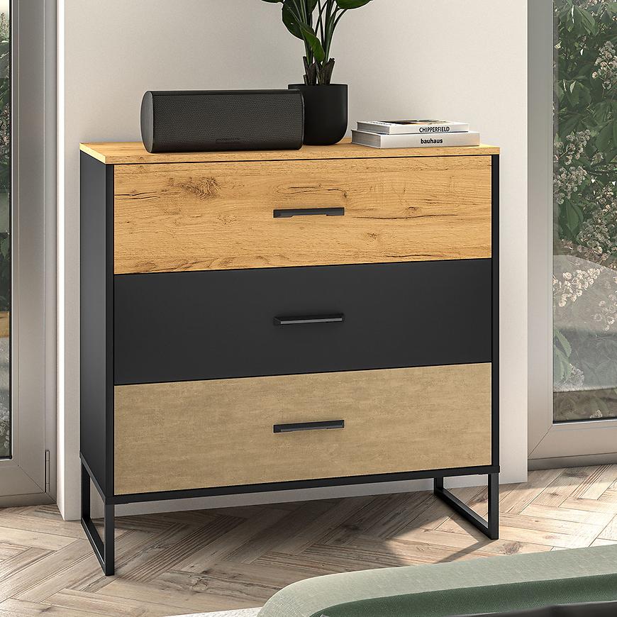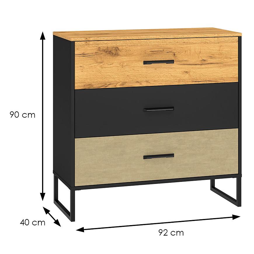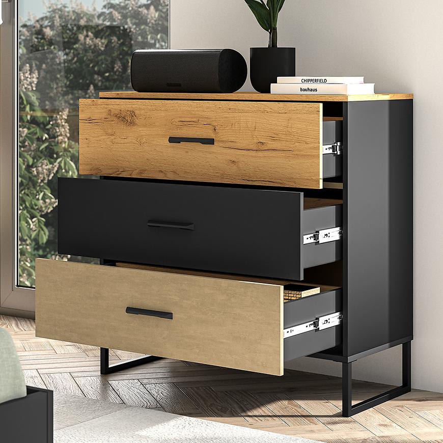 Fronty komody są wykończone w kolorze stal premium, co nadaje mu nowoczesnego i eleganckiego charakteru. Całość wykończona jest w matowej teksturze, co dodaje mu subtelnej elegancji. Korpus komodau w kolorze czarnym również ma matowe wykończenie, co tworzy harmonijną i stylową całość.