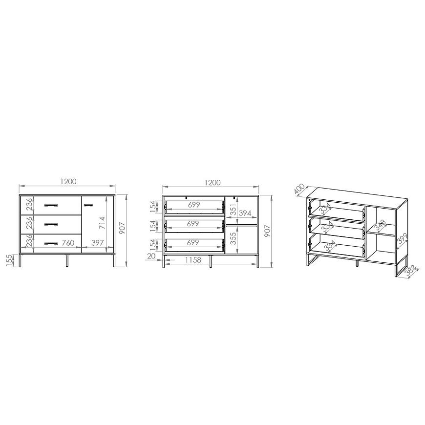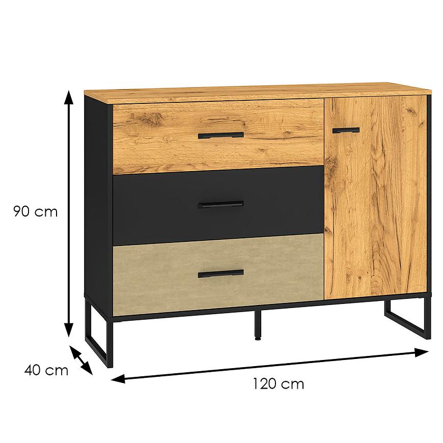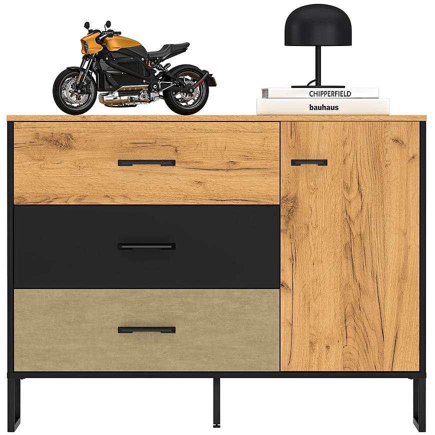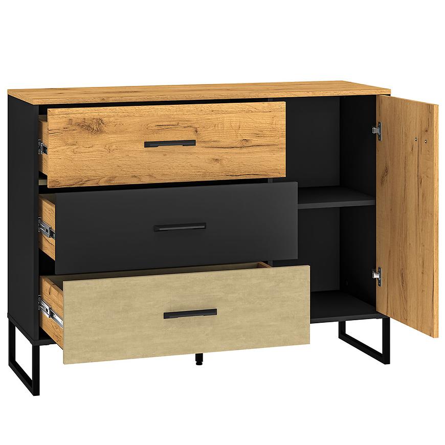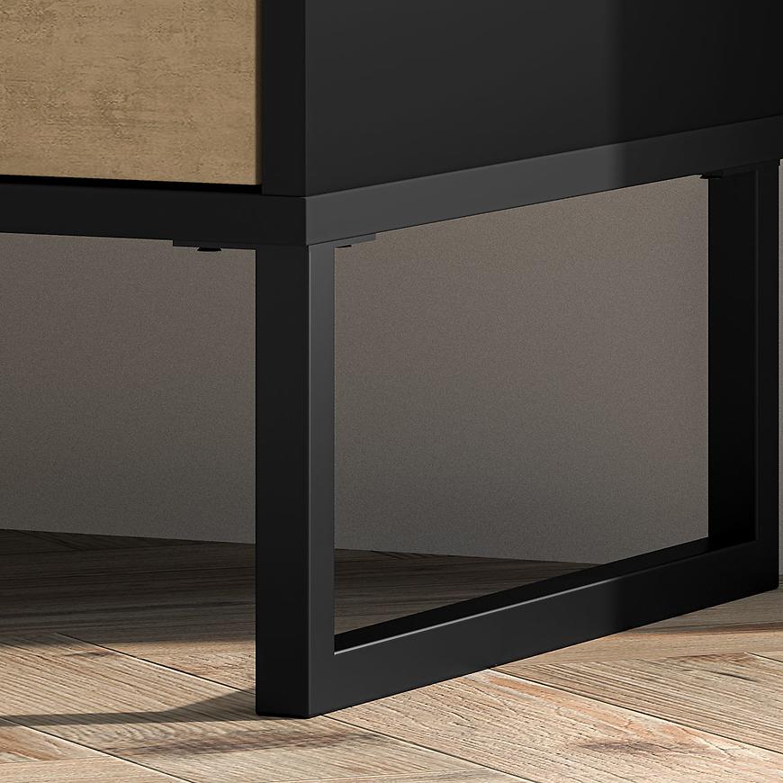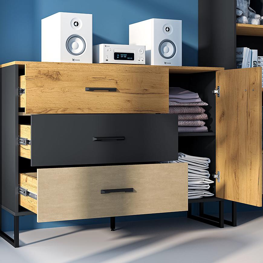 Fronty komodau są wykończone w kolorze stal premium, co nadaje mu nowoczesnego i eleganckiego charakteru. Całość wykończona jest w matowej teksturze, co dodaje mu subtelnej elegancji. Korpus komodau w kolorze czarnym również ma matowe wykończenie, co tworzy harmonijną i stylową całość.