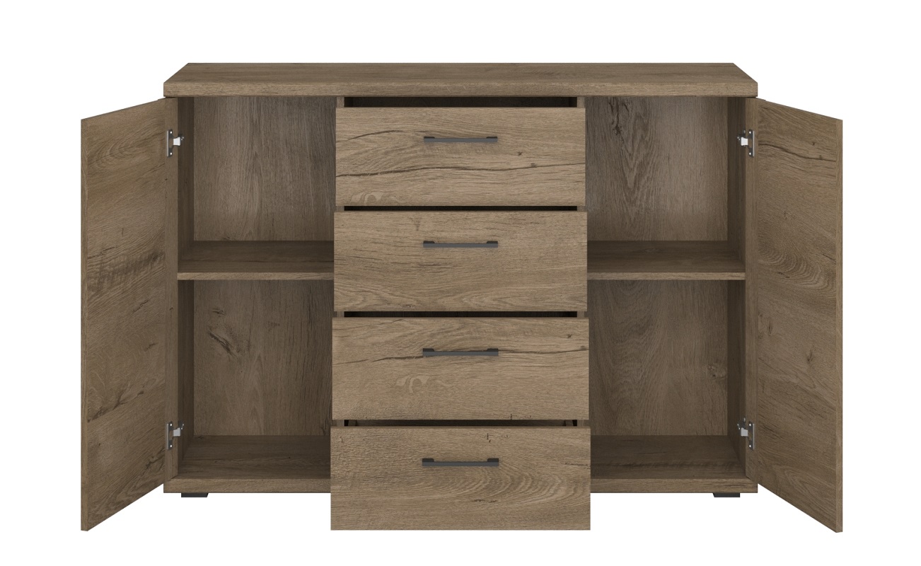 Praktyczność komody Cordan podkreślają cztery pojemne szuflady, które umożliwiają segregację i organizację drobnych przedmiotów. Dzięki nim utrzymasz porządek w pomieszczeniu bez trudu. Dodatkowo, dwie półki znajdujące się za drzwiami oferują miejsce na wyeksponowanie dekoracji czy przechowywanie przedmiotów, które chcesz mieć zawsze pod ręką.