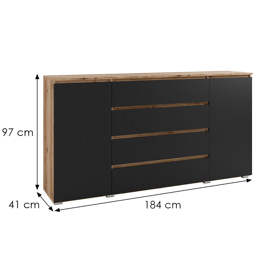 Zestaw ma 184 cm szerokości, 97 cm wysokości i 41 cm głębokości, co sprawia, że doskonale wypełnia przestrzeń w salonie, jadalni lub przedpokoju. Komoda wyposażona jest w dwudrzwiową konstrukcję oraz co najmniej 4 szuflady, które umożliwiają wygodne przechowywanie zarówno odzieży, dokumentów, jak i drobnych przedmiotów codziennego użytku.