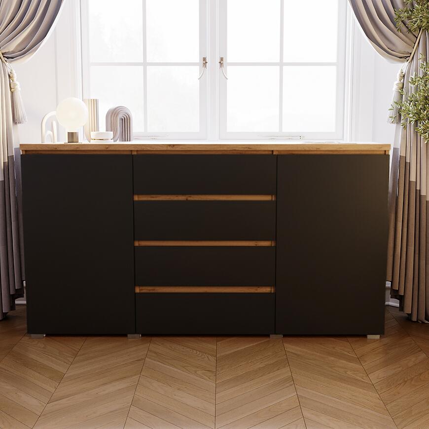 Dzięki przemyślanemu układowi szuflad i drzwi komoda umożliwia łatwy dostęp do przechowywanych rzeczy, a jednocześnie pozwala utrzymać porządek w pomieszczeniu. Matowe fronty w kolorze czarnym harmonizują z ciemnym drewnopodobnym korpusem, tworząc nowoczesną, spójną aranżację.