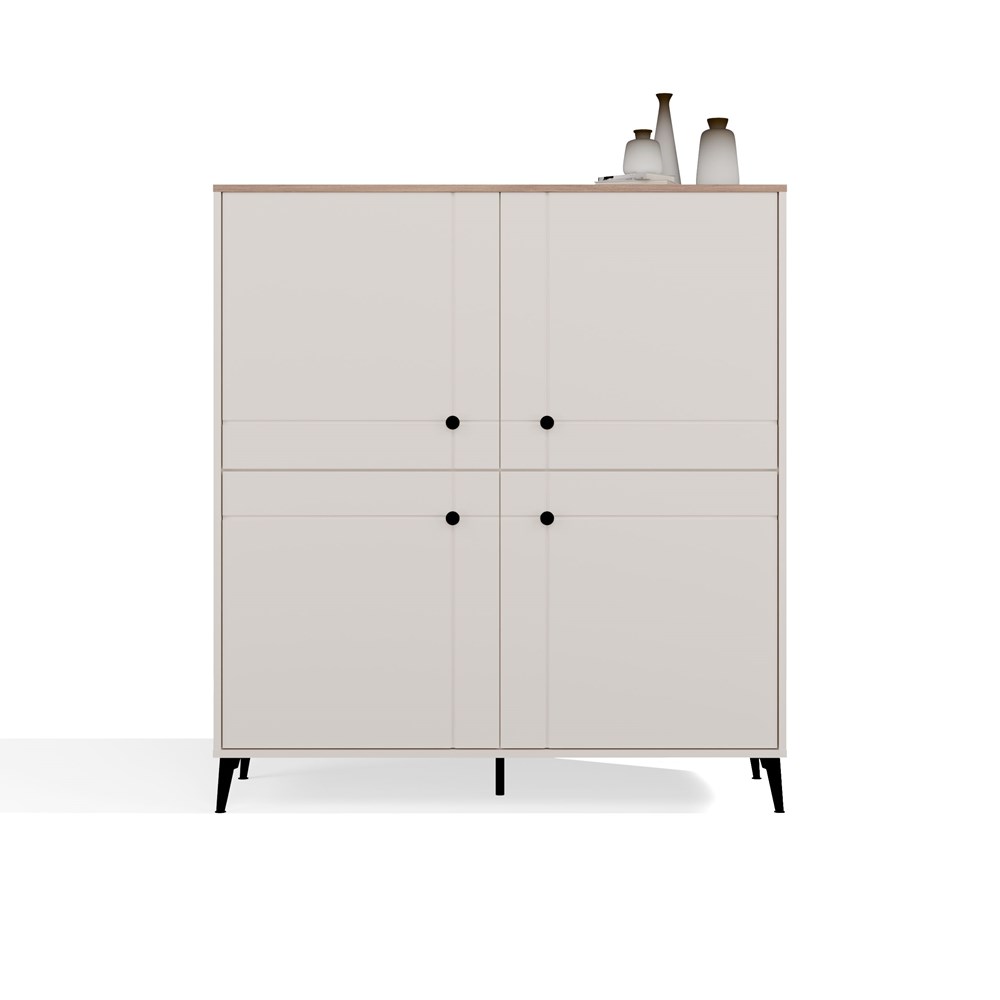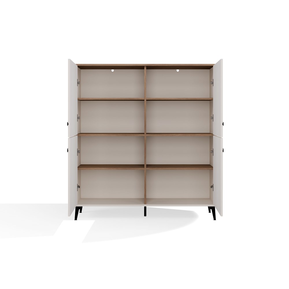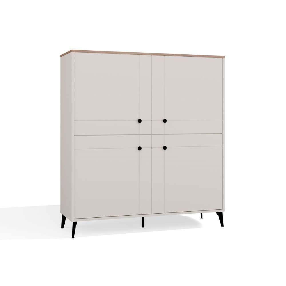 Model wyposażony jest w cztery drzwi z systemem cichego domyku, który umożliwia komfortowe użytkowanie każdego dnia. Mechanizm działa płynnie i delikatnie, co zapewnia wygodę oraz chroni fronty przed zbędnym obciążeniem. Za każdym z czterech frontów znajduje się zestaw praktycznych półek. Łącznie osiem komór daje możliwość uporządkowania książek, dokumentów, tekstyliów, dekoracji oraz wszelkich akcesoriów codziennego użytku.