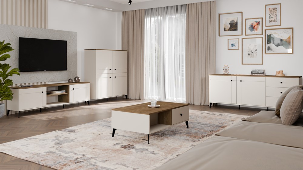 Jej proporcje oraz subtelnie wyważona kolorystyka sprawiają, że stanowi idealny wybór do wnętrz, gdzie liczy się równowaga i estetyczna spójność. Dzięki wysokim metalowym nogom mebel wygląda lekko, a jednocześnie zachowuje stabilną konstrukcję. To połączenie stylu i praktyczności, które docenią zarówno miłośnicy minimalizmu, jak i osób wybierających bardziej dekoracyjne aranżacje.