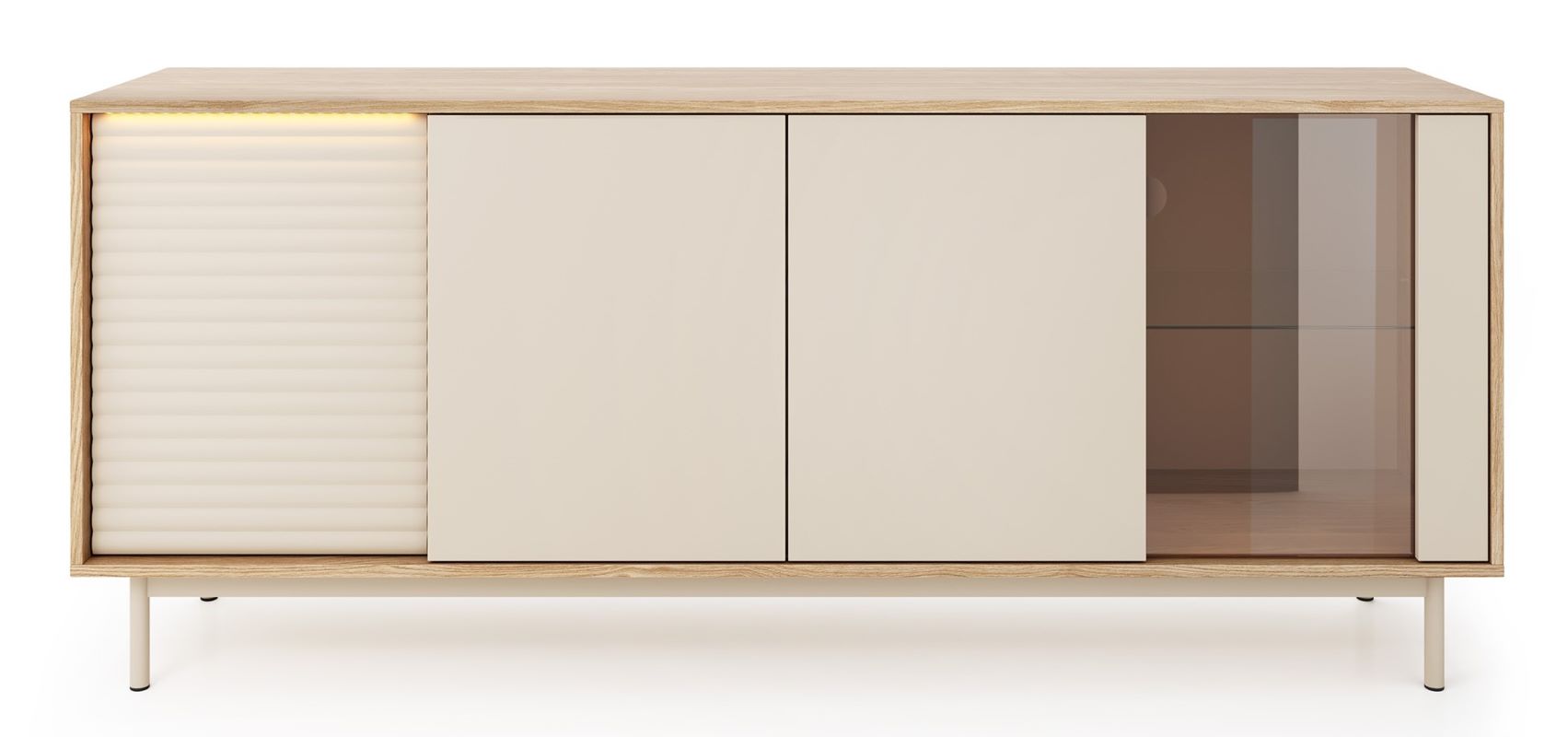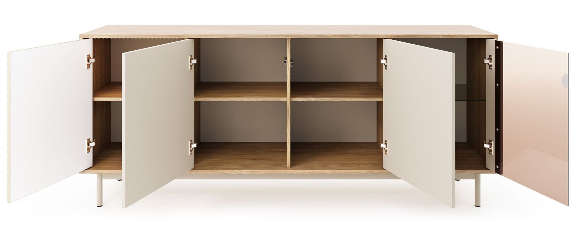 Komoda Tila TI2 to połączenie nowoczesnego wzornictwa z praktycznym zastosowaniem. Jej czterodrzwiowa konstrukcja oferuje przestrzeń do przechowywania na czterech półkach, zapewniając funkcjonalność przy zachowaniu minimalistycznej formy. Jasne, olejowane fronty w kolorze dębu kontrastują z korpusem w odcieniu kaszmir, tworząc eleganckie i harmonijne wykończenie.