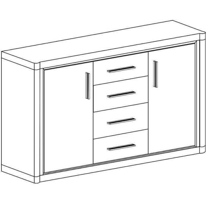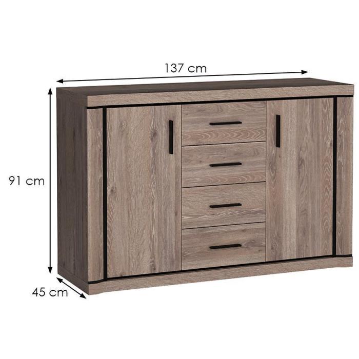 Komoda Dallas wpasuje się w każdą przestrzeń. Posiada cztery szuflady oraz dwie zamykane szafki, które pozwolą na odpowiednie zagospodarowanie. Komoda doskonale odnajdzie się w każdym pomieszczeniu, również w jadalni czy salonie.