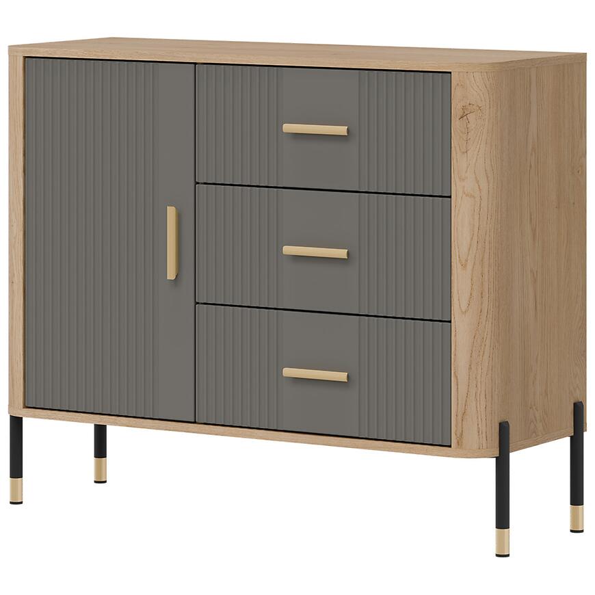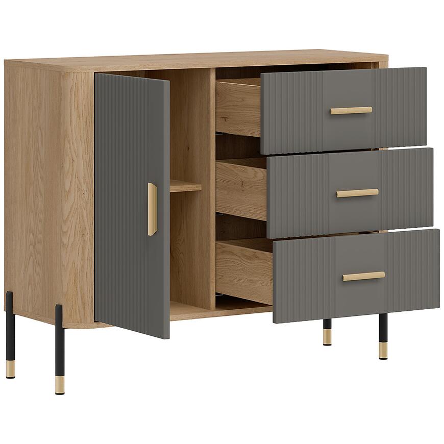 Komoda Dante Dt03 Dąb Cremona/Szary łączy elegancki, nowoczesny styl z funkcjonalnością. Jednodrzwiowa konstrukcja w połączeniu z trzema pojemnymi szufladami umożliwia wygodne przechowywanie dokumentów, tekstyliów, dekoracji i innych przedmiotów, pomagając utrzymać porządek w salonie, jadalni lub pokoju dziennym. Szare fronty harmonijnie zestawiono z jasnym korpusem w odcieniu dąb Cremona, tworząc uniwersalny i estetyczny mebel.