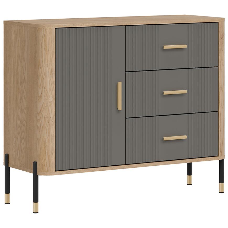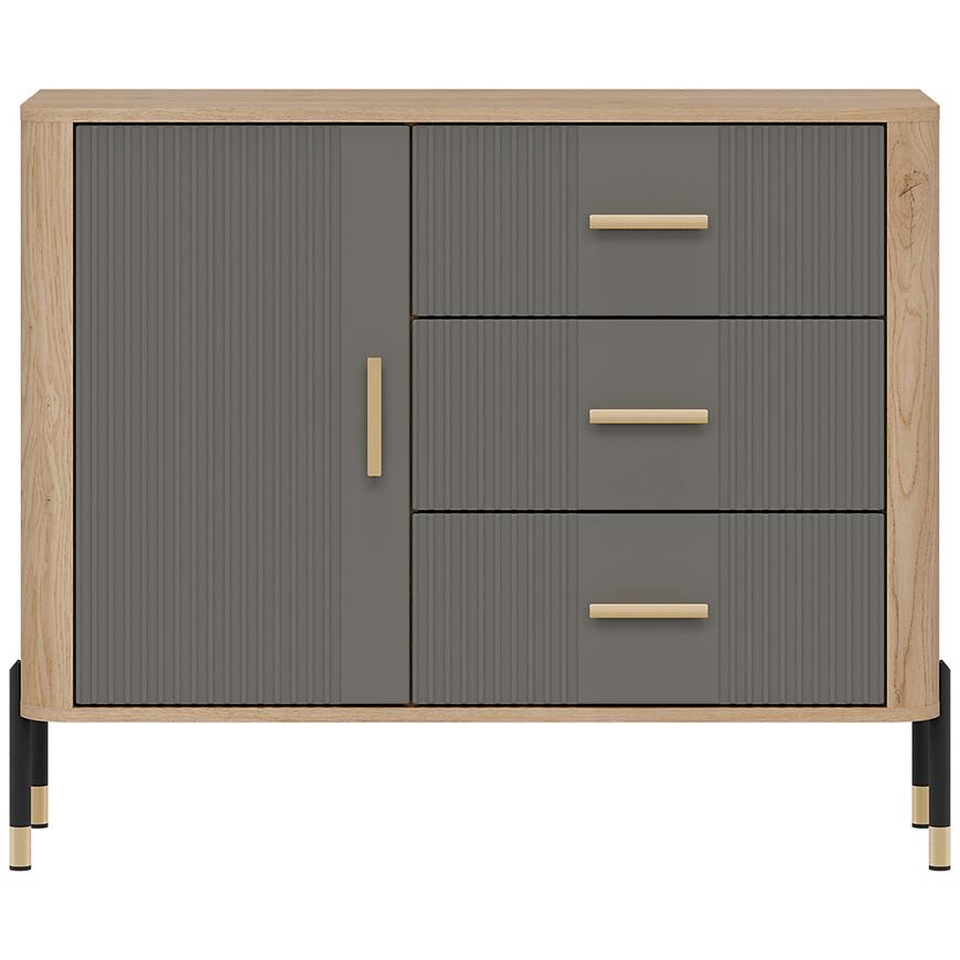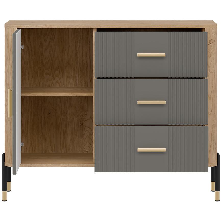 Fronty wykonano z trwałej płyty MDF w kolorze szarym, a korpus z laminowanej płyty wiórowej w odcieniu dąb Cremona. Matowe wykończenie frontów i korpusu nadaje komodzie nowoczesny charakter i ułatwia codzienne użytkowanie. Trzy praktyczne szuflady zwiększają funkcjonalność mebla, umożliwiając wygodne przechowywanie drobnych przedmiotów.