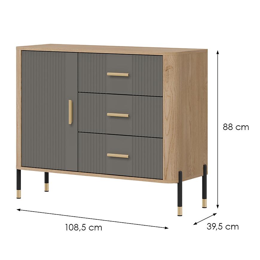 Komoda ma wymiary: szerokość 108,5 cm, wysokość 88 cm i głębokość 39,5 cm, co zapewnia odpowiednią powierzchnię do przechowywania przy kompaktowych wymiarach, które łatwo wkomponować w różne wnętrza.
