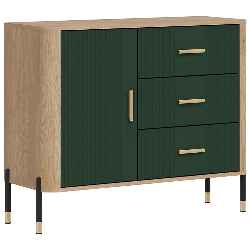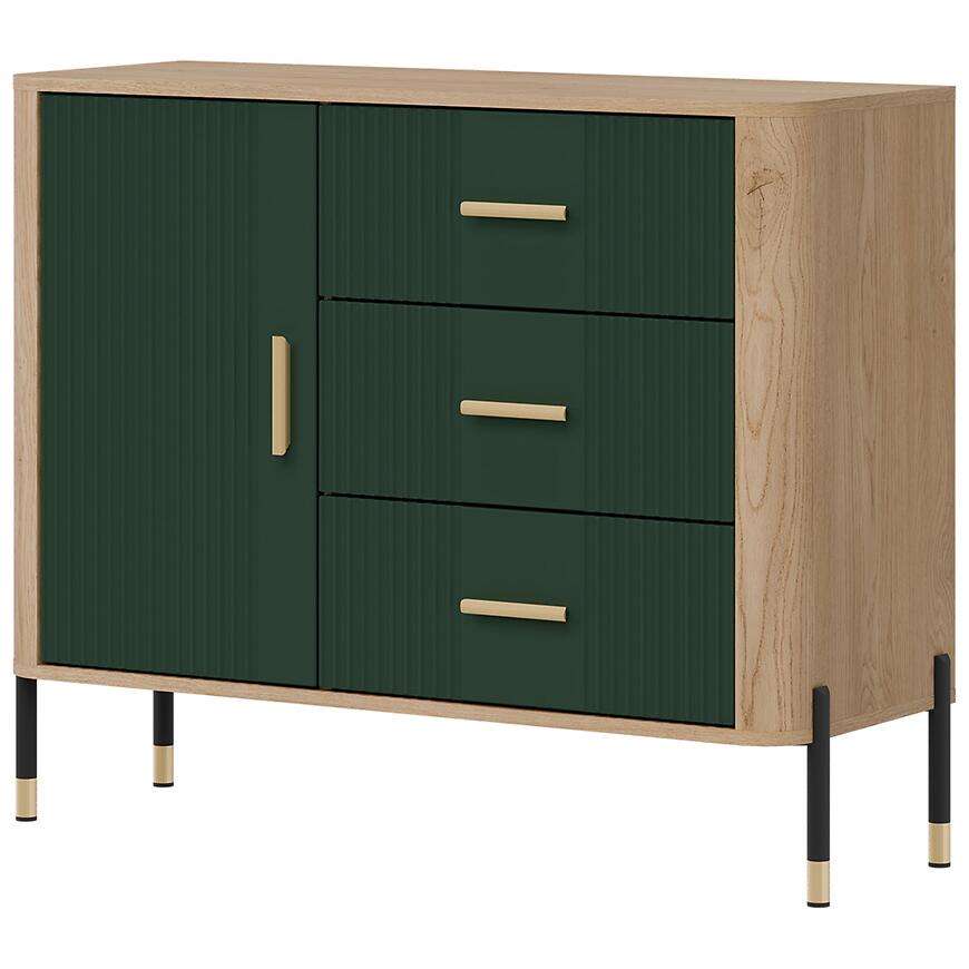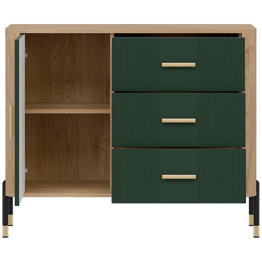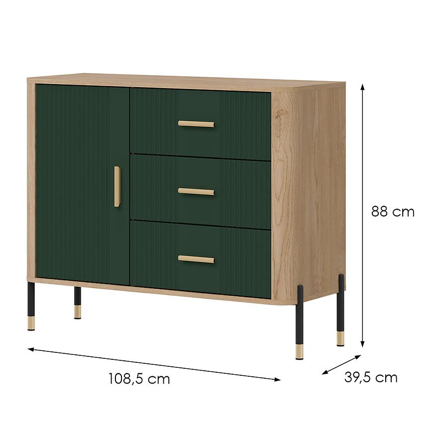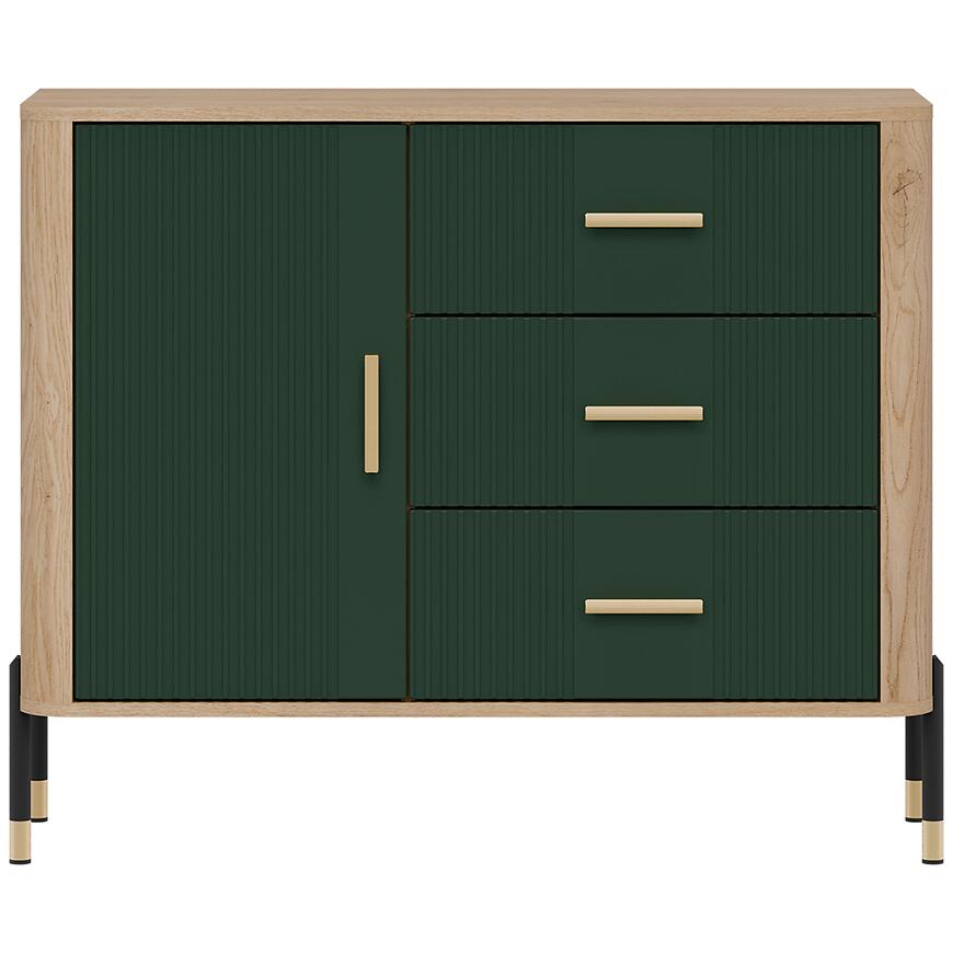 Fronty wykonano z trwałej płyty MDF w kolorze zielonym, a korpus z laminowanej płyty wiórowej w odcieniu dąb Cremona. Matowe wykończenie nadaje meblowi nowoczesny charakter i ułatwia codzienne użytkowanie. Trzy szuflady zwiększają funkcjonalność komody, umożliwiając wygodne przechowywanie drobiazgów.