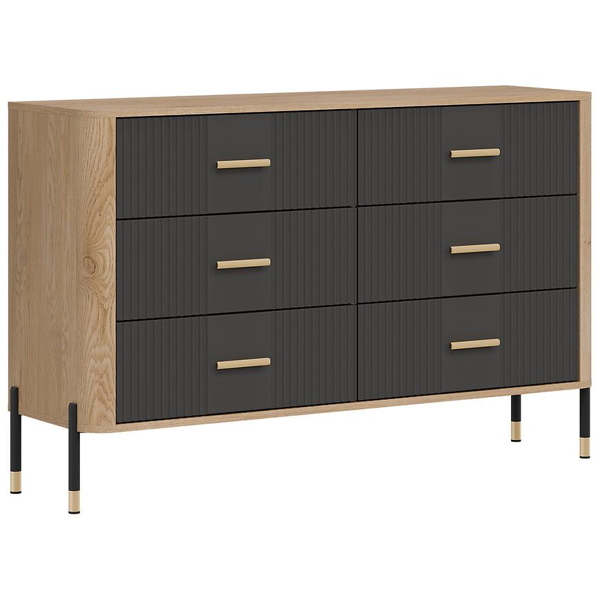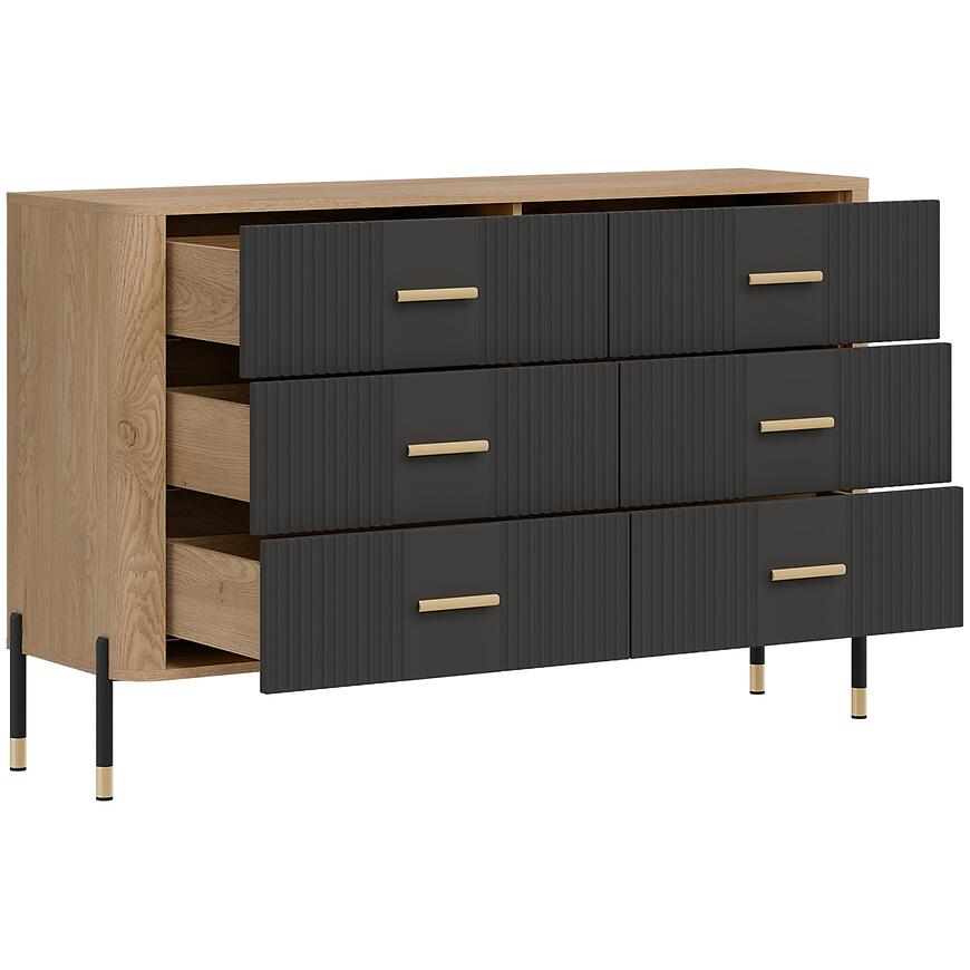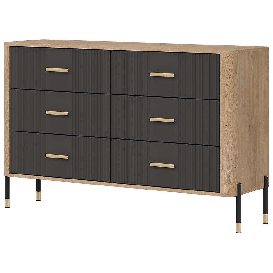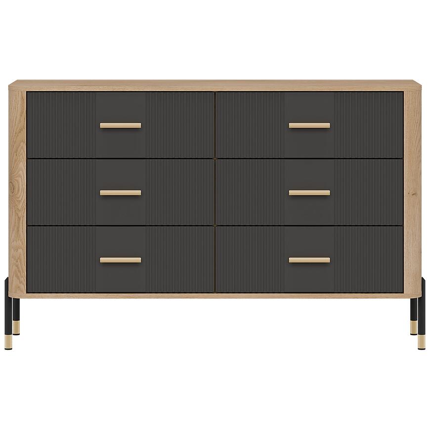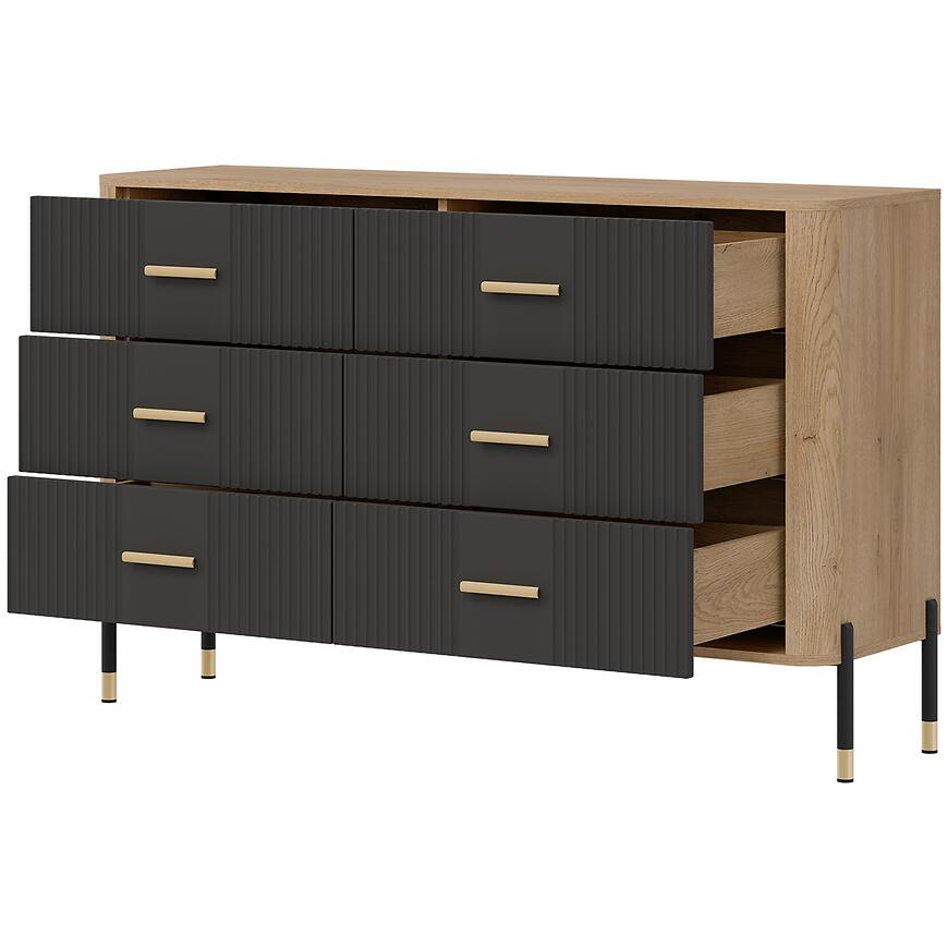 Fronty wykonano z trwałej płyty MDF w kolorze antracyt, natomiast korpus z laminowanej płyty wiórowej w odcieniu dąb Cremona. Matowe wykończenie frontów i korpusu nadaje komodzie nowoczesny charakter i ułatwia codzienne użytkowanie. Liczne szuflady zwiększają funkcjonalność mebla, umożliwiając wygodne przechowywanie drobnych przedmiotów i akcesoriów.