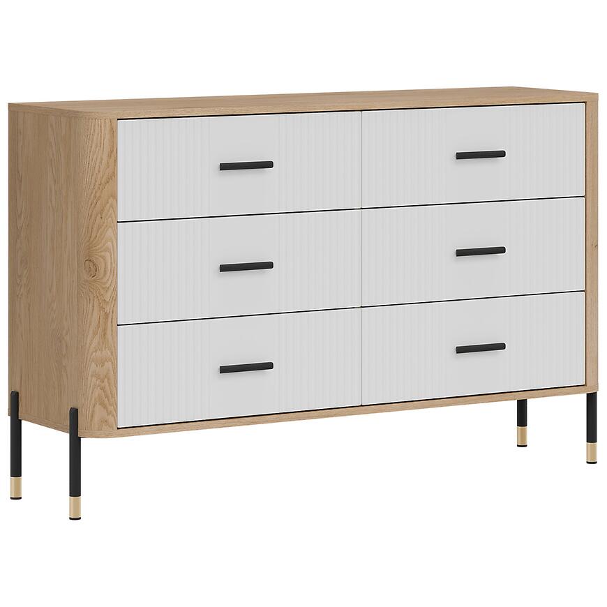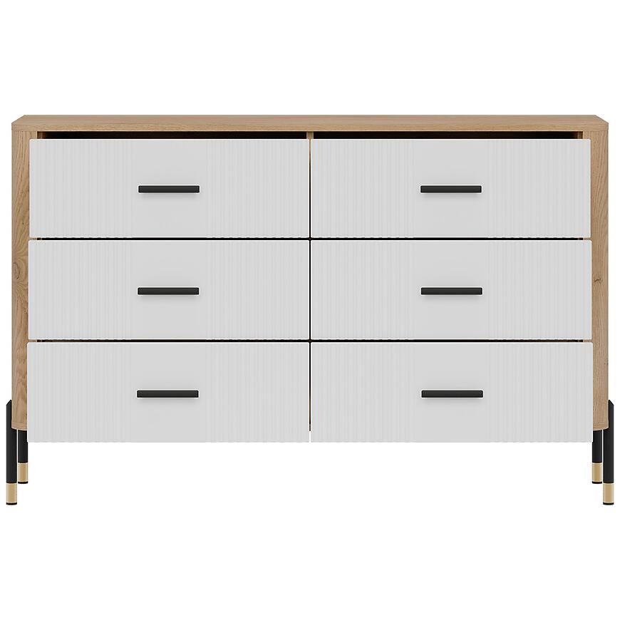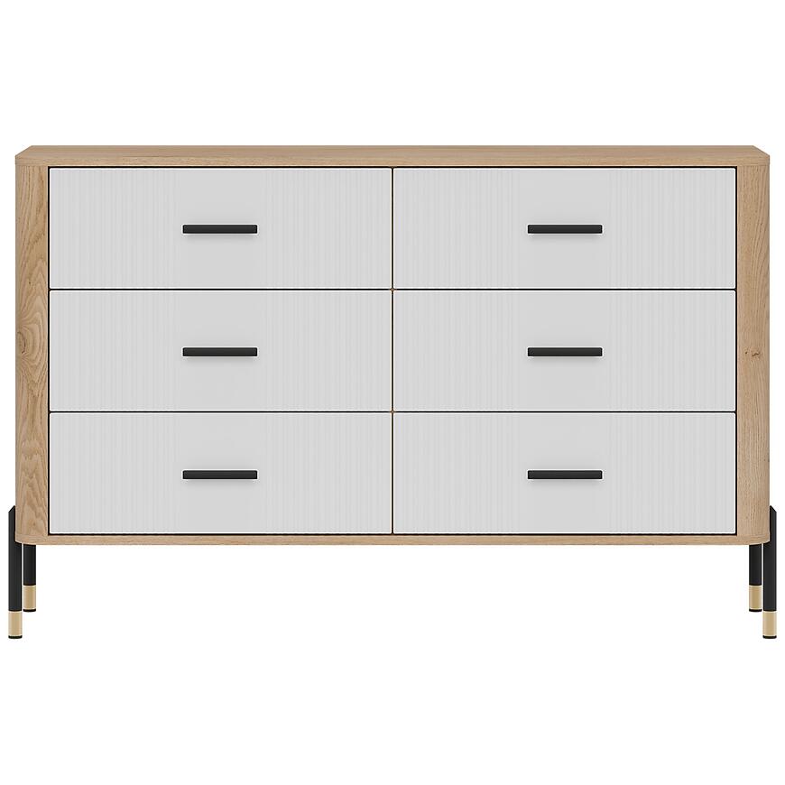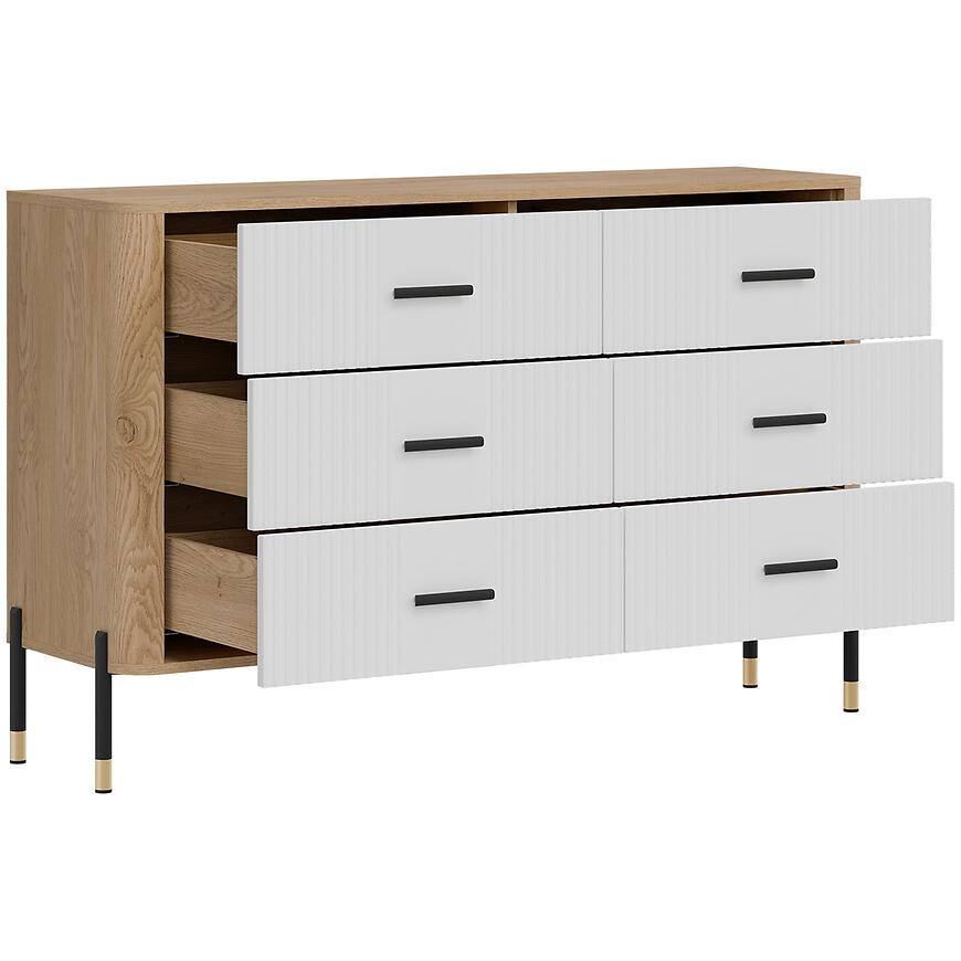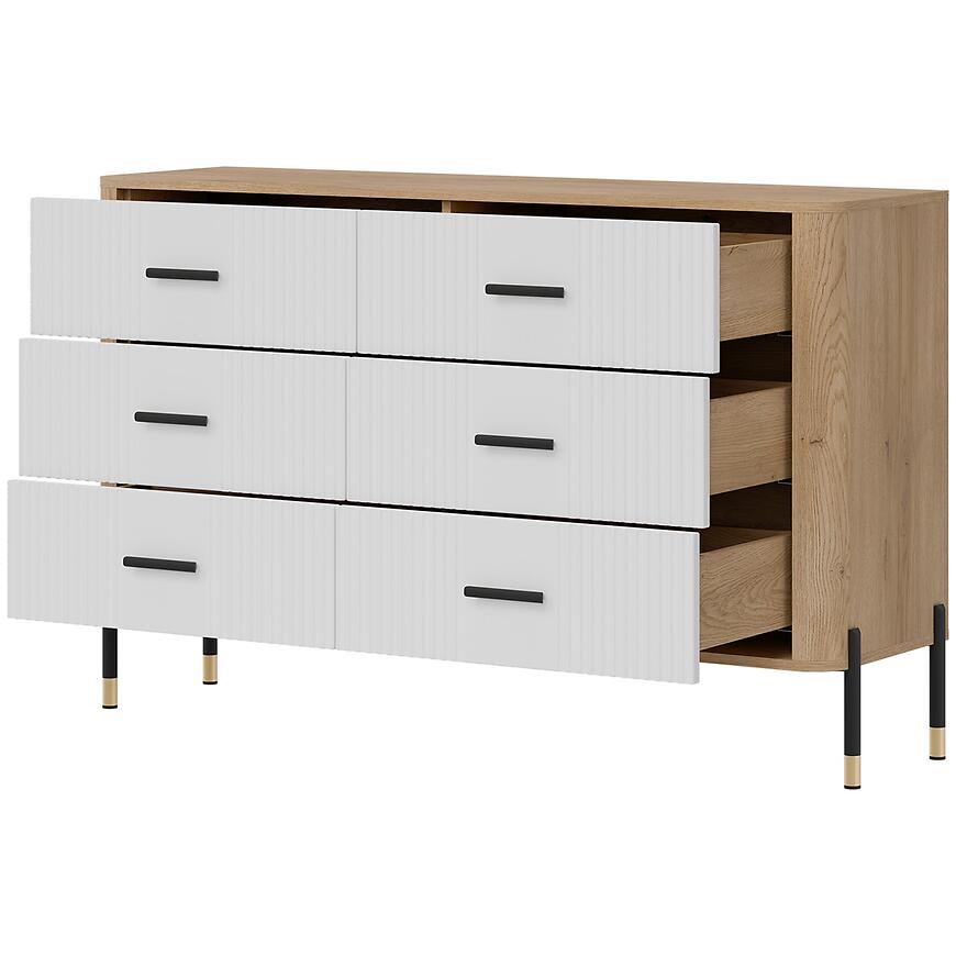 Fronty wykonano z trwałej płyty MDF w kolorze białym, a korpus z laminowanej płyty wiórowej w odcieniu dąb Cremona. Matowe wykończenie podkreśla nowoczesny charakter komody i ułatwia codzienne użytkowanie. Liczne szuflady zwiększają funkcjonalność mebla, umożliwiając wygodne przechowywanie drobiazgów i akcesoriów.