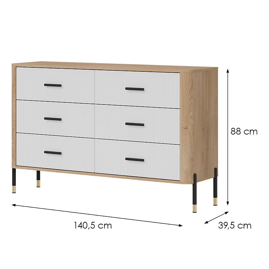Komoda ma wymiary: szerokość 140,5 cm, wysokość 88 cm i głębokość 39,5 cm, co zapewnia optymalną przestrzeń do przechowywania przy kompaktowych wymiarach.