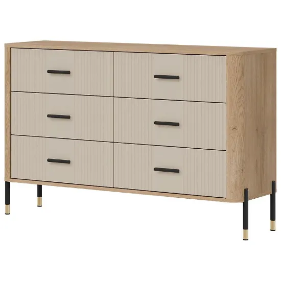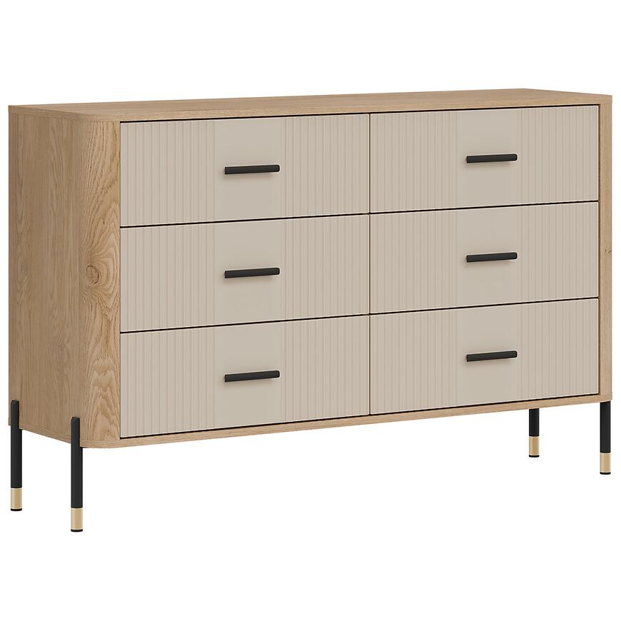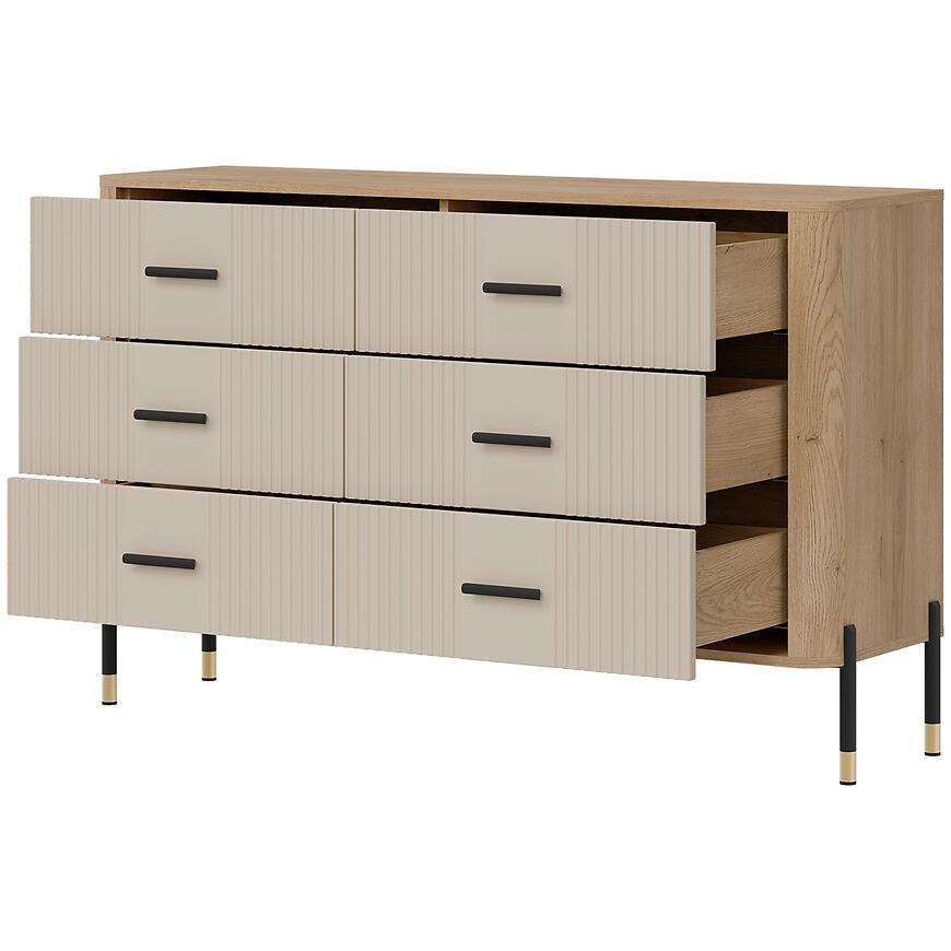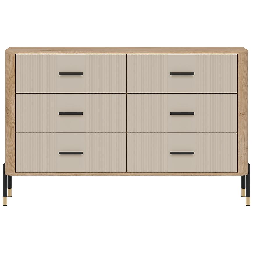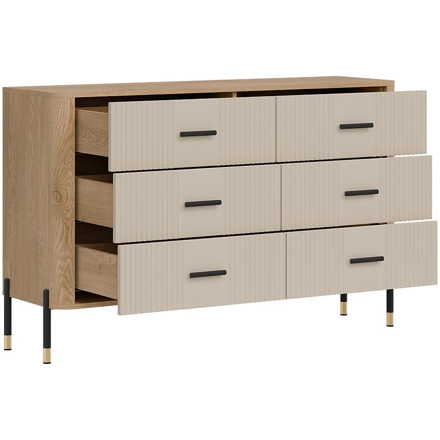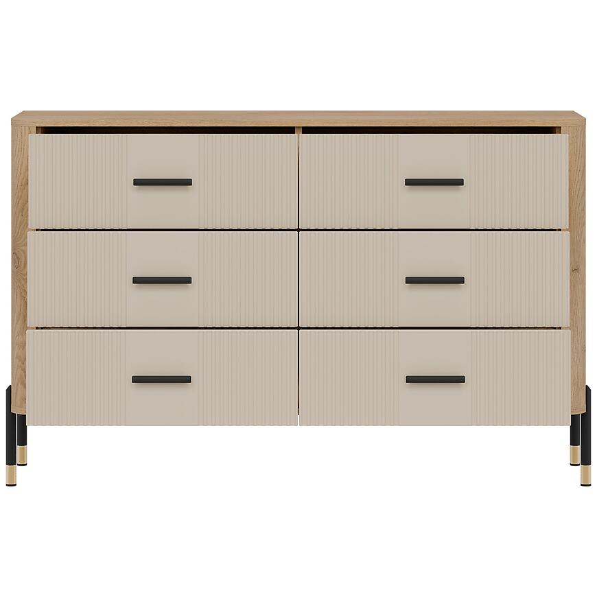 Komoda Dante Dt04 Dąb Cremona/Kaszmir łączy elegancki wygląd z funkcjonalnym przechowywaniem. Posiada cztery i więcej pojemnych szuflad, które pozwalają utrzymać porządek w salonie, pokoju dziennym czy jadalni. Fronty w modnym kolorze kaszmir w matowym wykończeniu doskonale komponują się z jasnym korpusem w odcieniu dąb Cremona, tworząc harmonijny i uniwersalny mebel pasujący do nowoczesnych wnętrz.