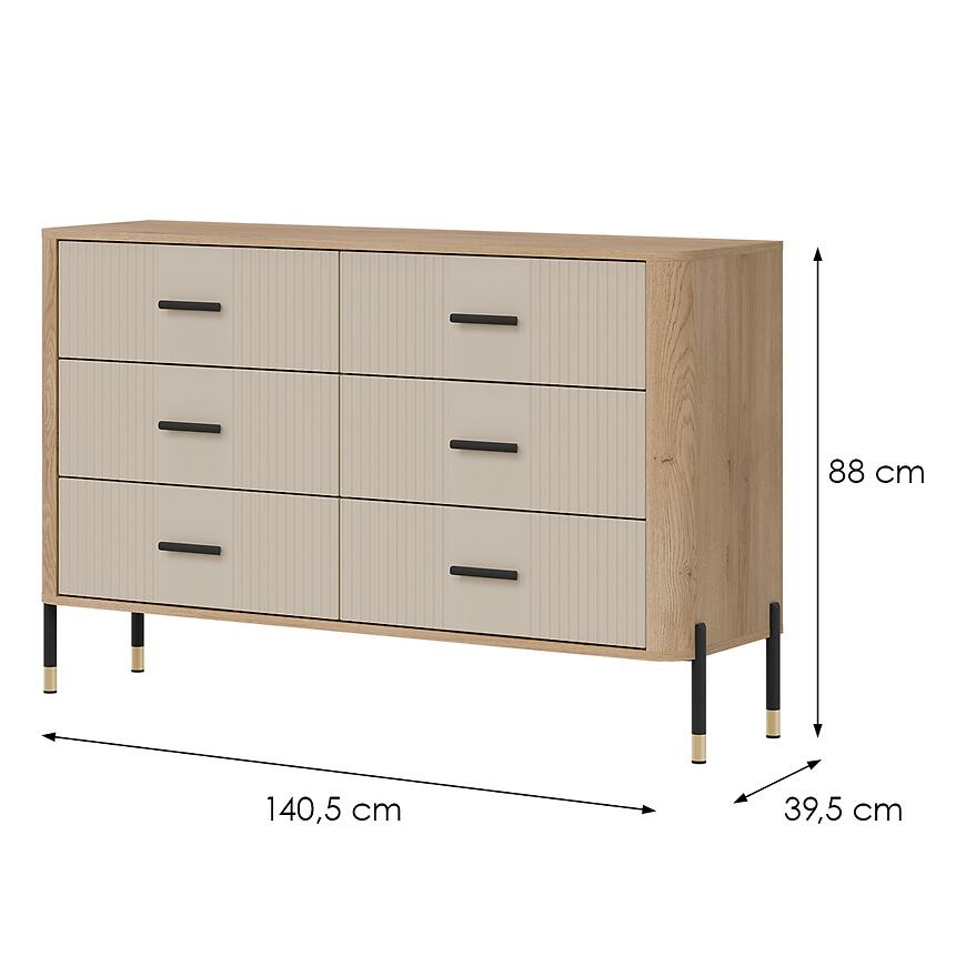 Komoda ma wymiary: szerokość 140,5 cm, wysokość 88 cm i głębokość 39,5 cm, co zapewnia dużą powierzchnię do przechowywania przy kompaktowych rozmiarach.