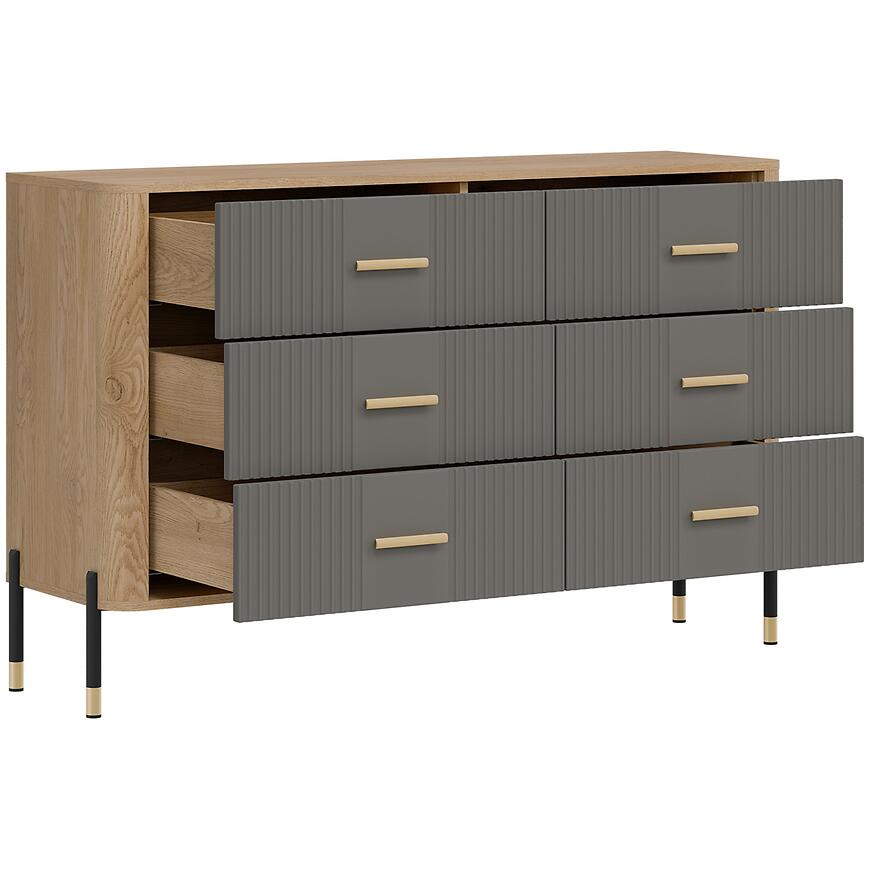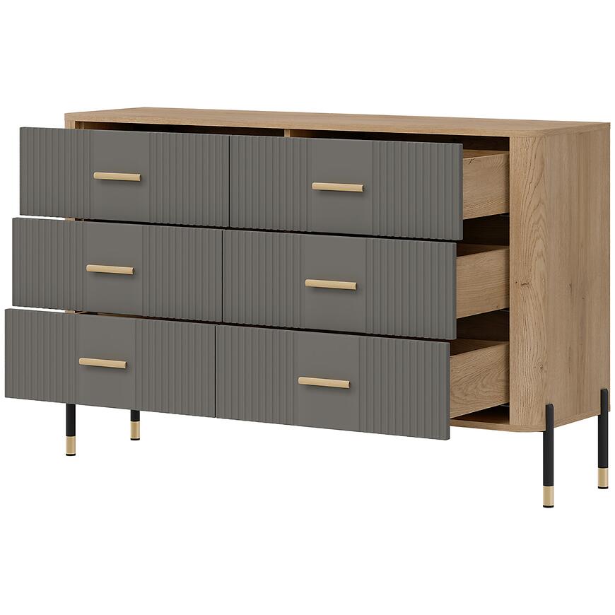 Fronty wykonano z wytrzymałej płyty MDF, a korpus z laminowanej płyty wiórowej w kolorze dąb Cremona. Matowe wykończenie dodaje elegancji, a jednocześnie ułatwia codzienne użytkowanie. Liczne szuflady gwarantują wygodny dostęp do przechowywanych przedmiotów.