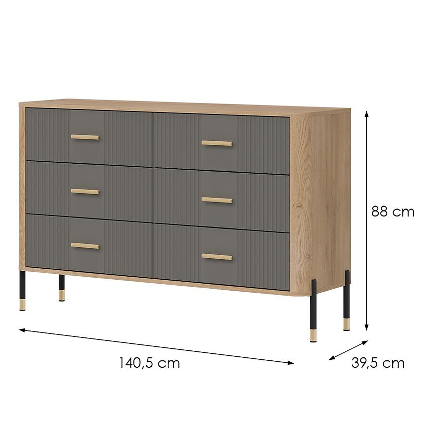 Komoda ma wymiary: szerokość 140,5 cm, wysokość 88 cm i głębokość 39,5 cm, co zapewnia dużą pojemność przy kompaktowej konstrukcji.