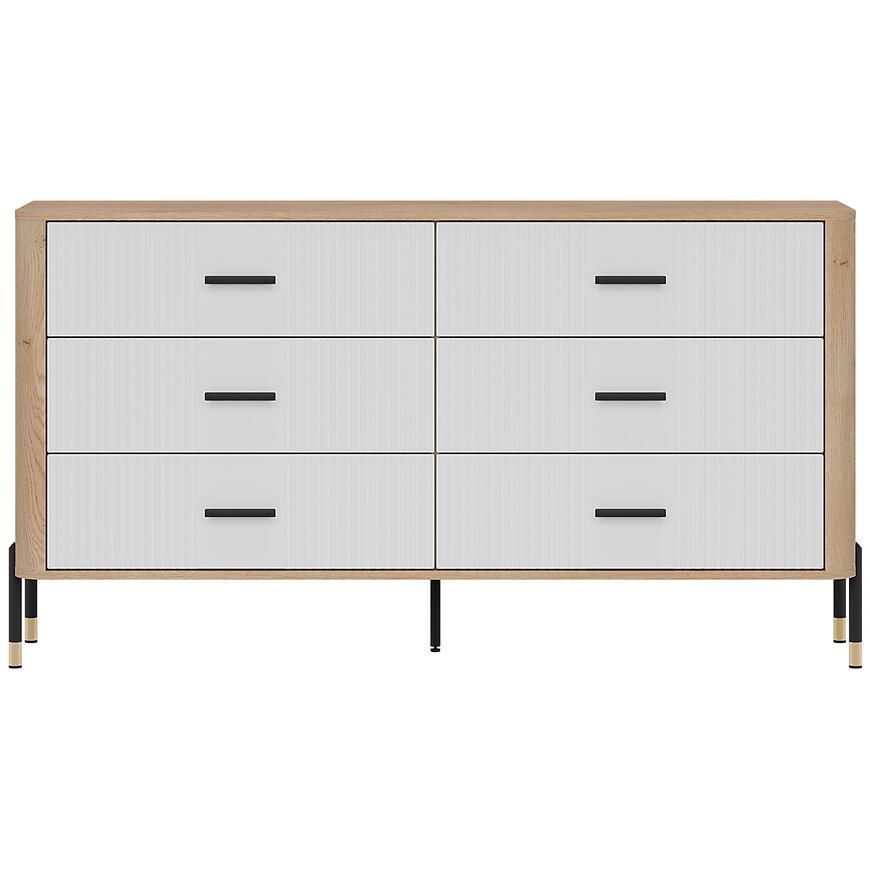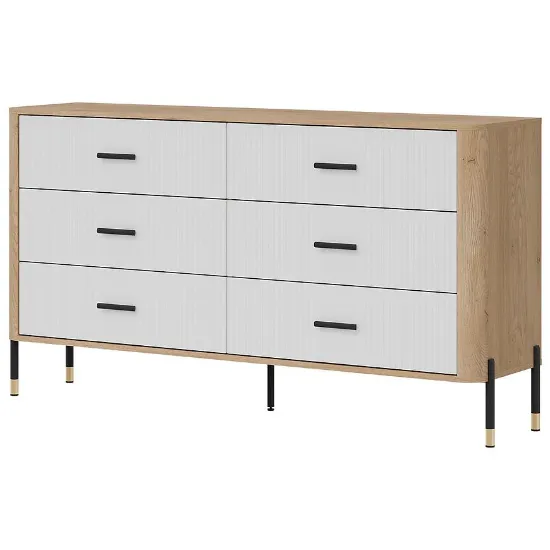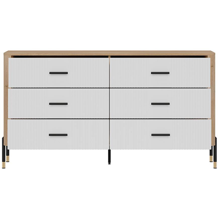 Fronty komody wykonano z płyty MDF w kolorze białym, a korpus z laminowanej płyty wiórowej w odcieniu dąb Cremona. Takie połączenie materiałów zapewnia trwałość, odporność na codzienne użytkowanie oraz łatwość utrzymania czystości. Funkcjonalne szuflady zwiększają praktyczność mebla, pozwalając wygodnie przechowywać akcesoria codziennego użytku.