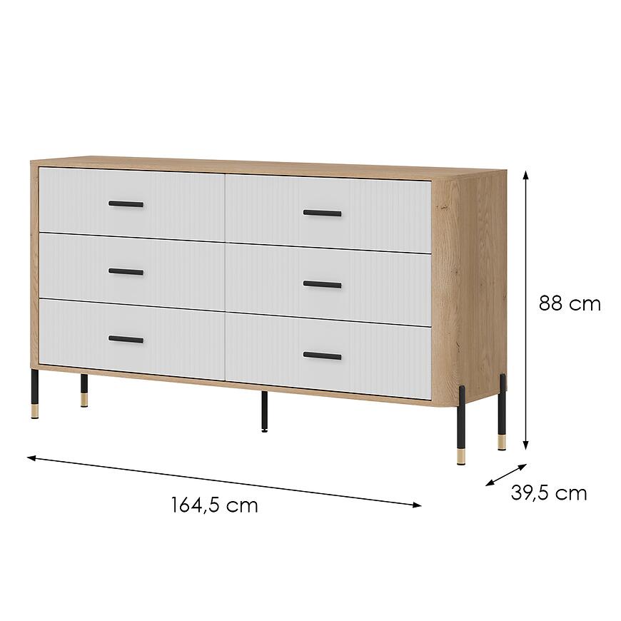 Komoda ma szerokość 164,5 cm, wysokość 88 cm oraz głębokość 39,5 cm, co zapewnia dużą przestrzeń do przechowywania. Model posiada cztery lub więcej szuflad, które umożliwiają wygodne przechowywanie tekstyliów, dokumentów, dekoracji i innych przedmiotów, utrzymując wnętrze w porządku.