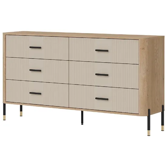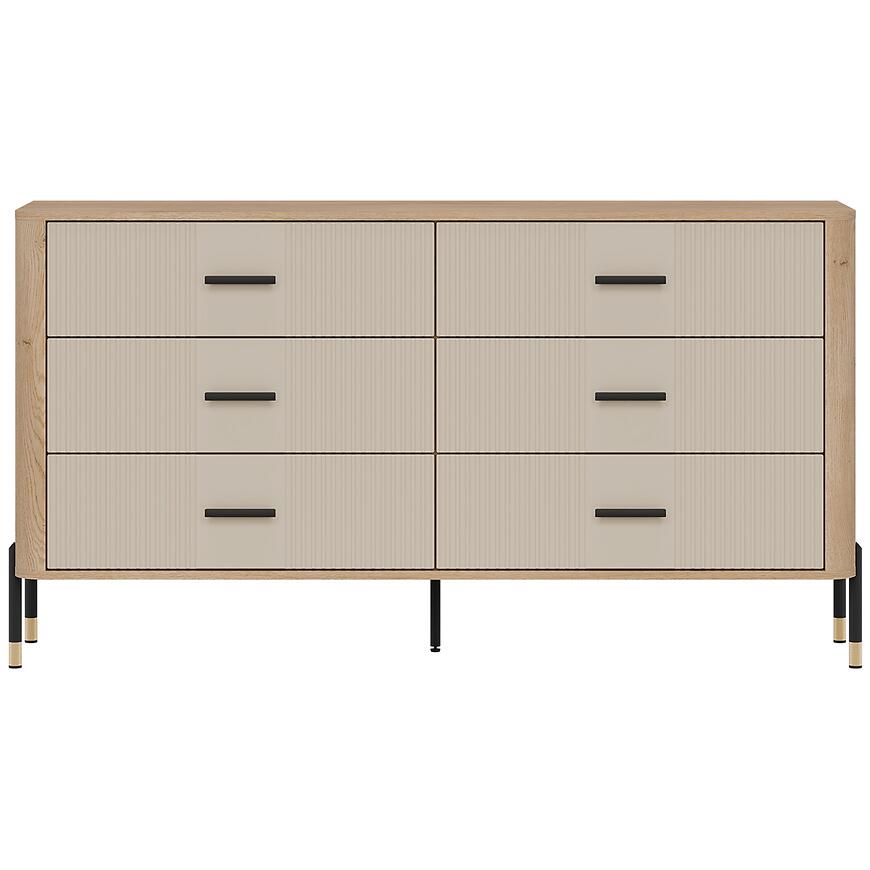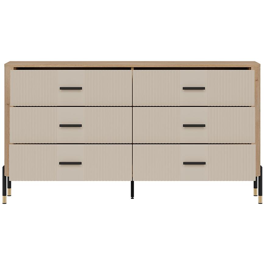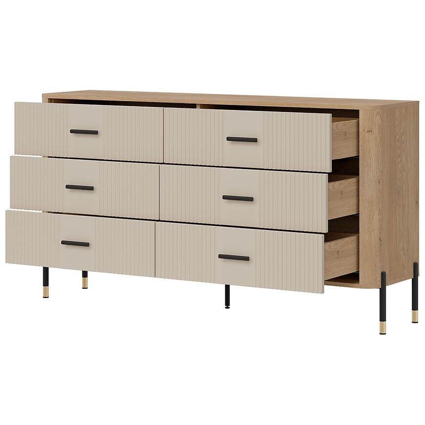 Fronty komody wykonano z płyty MDF w kolorze kaszmir, a korpus z laminowanej płyty wiórowej w odcieniu dąb Cremona. Takie połączenie materiałów zapewnia trwałość, odporność na codzienne użytkowanie oraz łatwość utrzymania czystości. Funkcjonalne szuflady zwiększają praktyczność mebla, pozwalając wygodnie przechowywać akcesoria codziennego użytku.