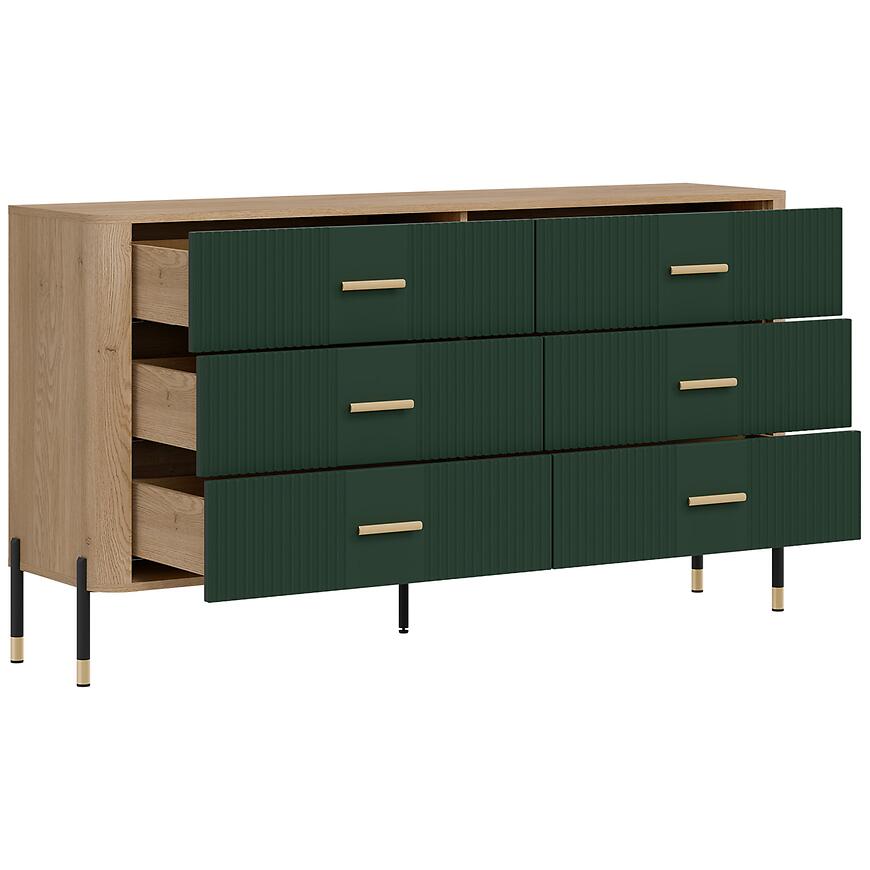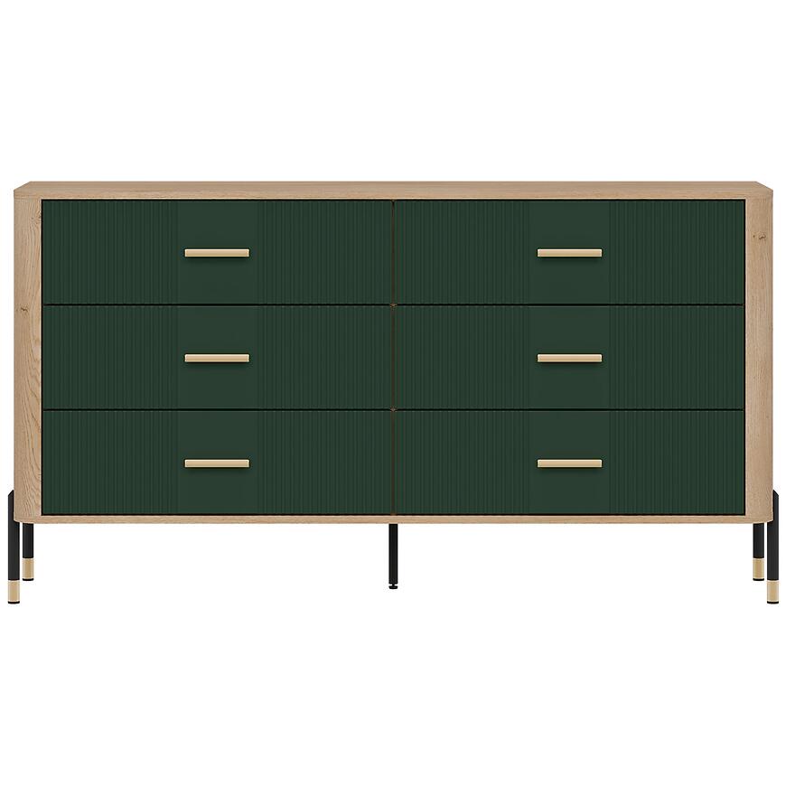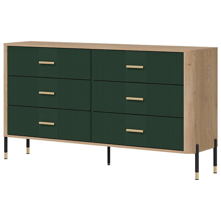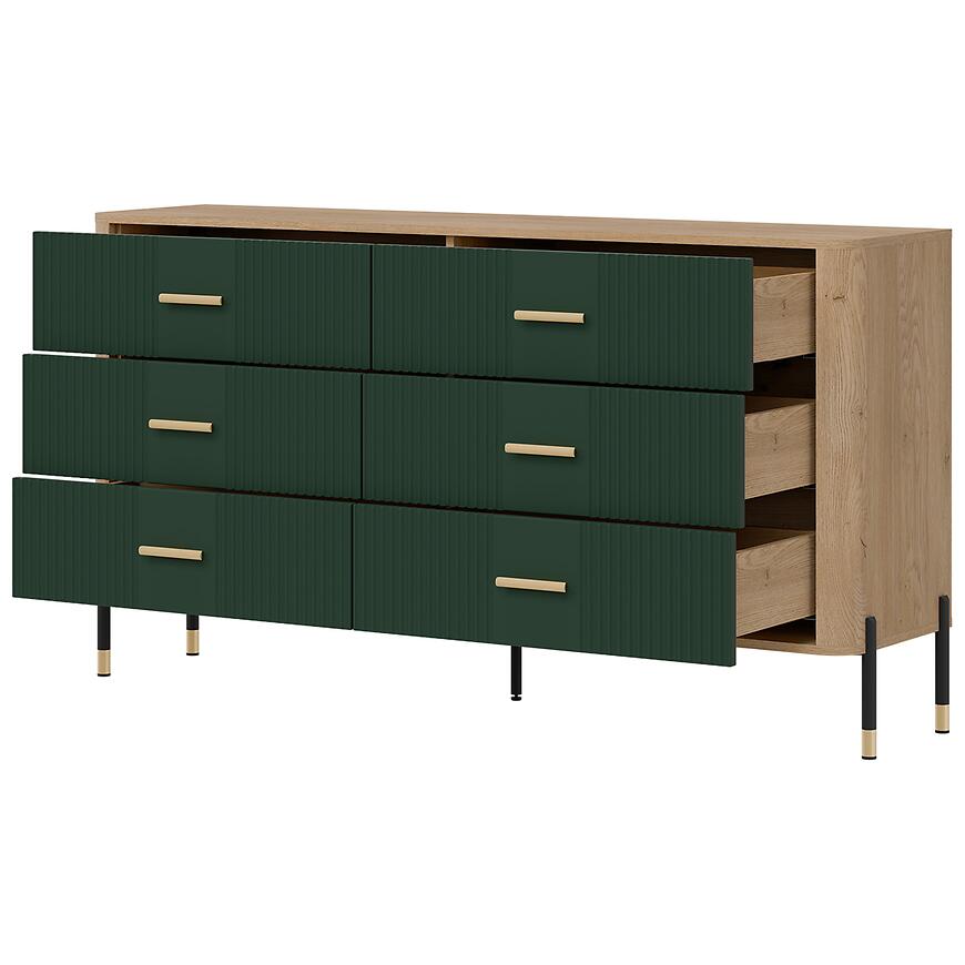 Fronty komody wykonano z płyty MDF w zielonym matowym wykończeniu, a korpus z laminowanej płyty wiórowej w odcieniu dąb Cremona. Takie połączenie materiałów zapewnia trwałość, odporność na codzienne użytkowanie oraz łatwość utrzymania czystości. Funkcjonalne szuflady zwiększają praktyczność mebla, pozwalając wygodnie przechowywać akcesoria codziennego użytku.