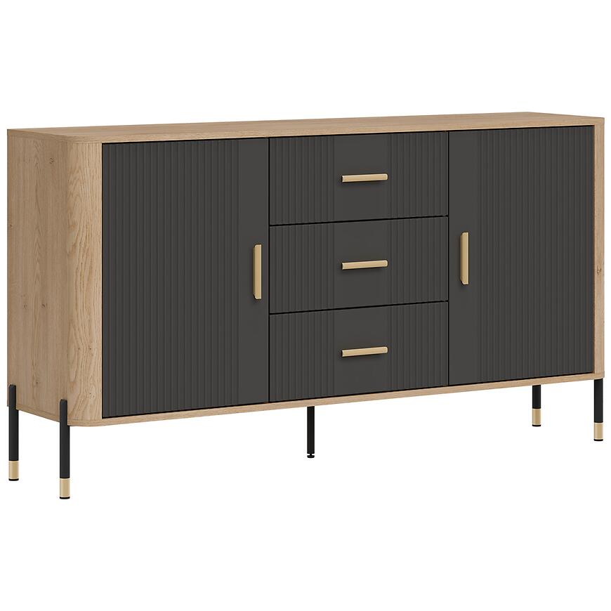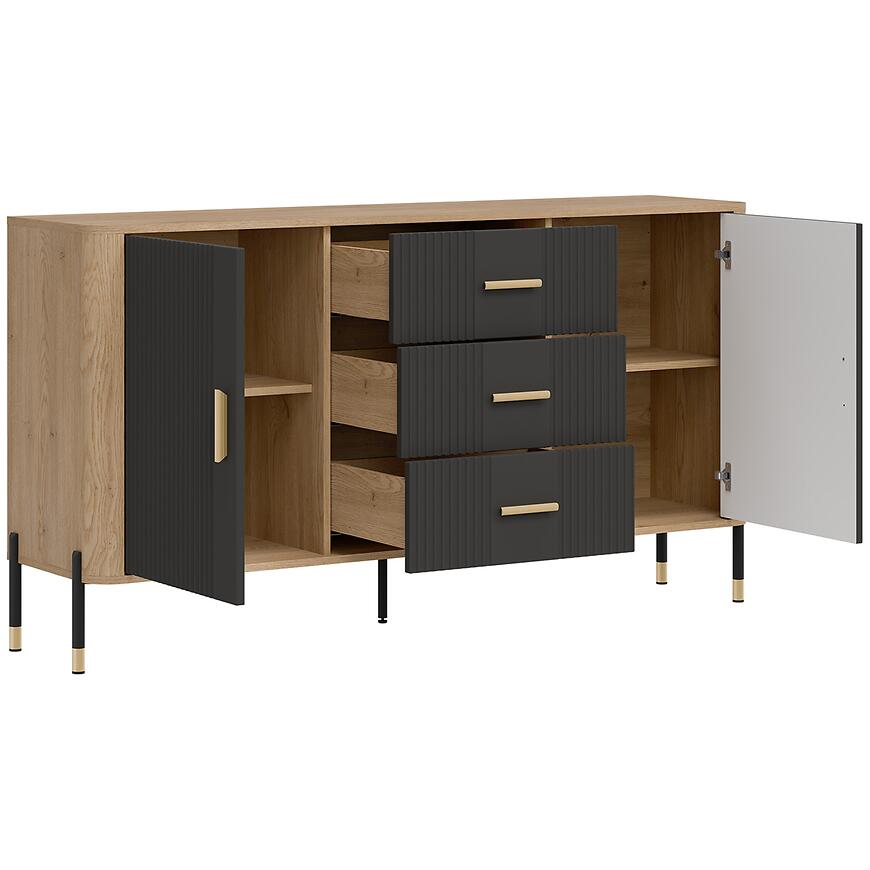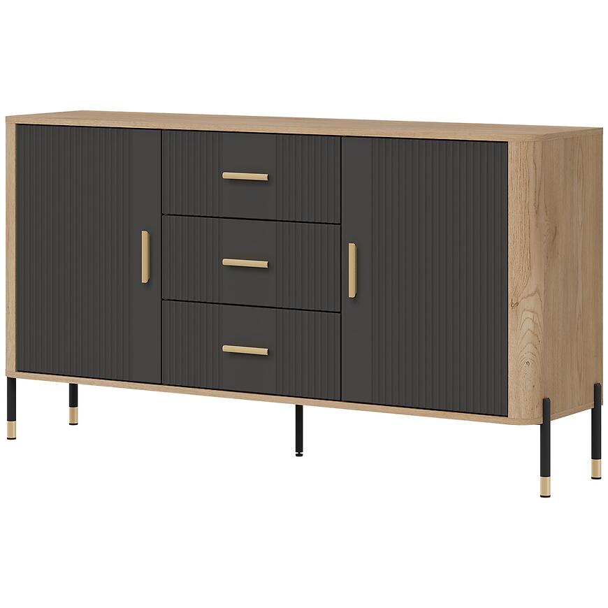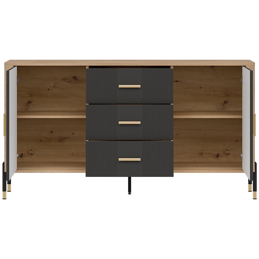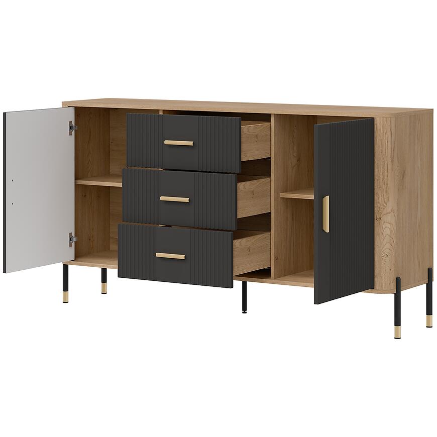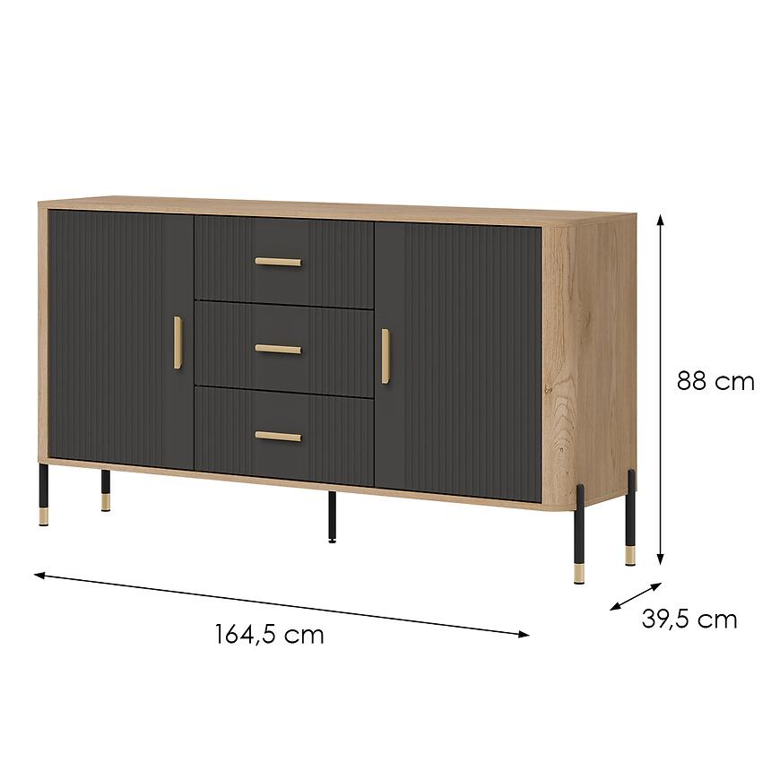 Komoda ma szerokość 164,5 cm, wysokość 88 cm i głębokość 39,5 cm, zapewniając przestrzeń do przechowywania różnych przedmiotów. Model posiada dwa drzwi oraz trzy szuflady, umożliwiając wygodne przechowywanie tekstyliów, dokumentów, dekoracji i innych akcesoriów, utrzymując wnętrze w porządku.