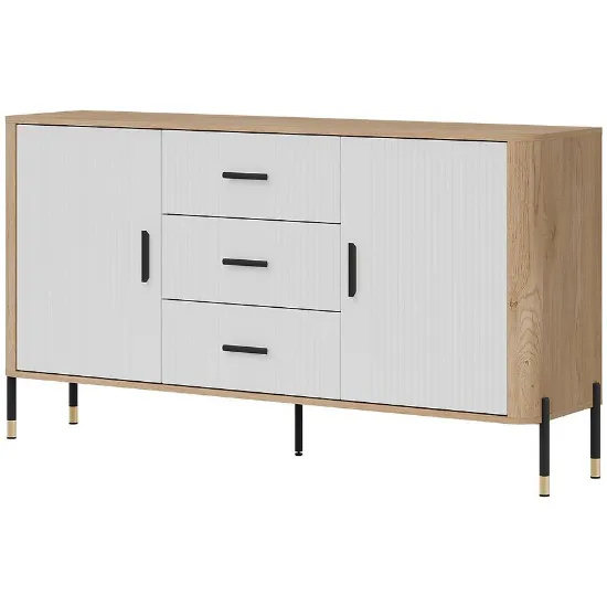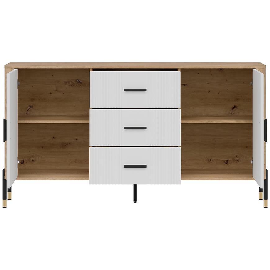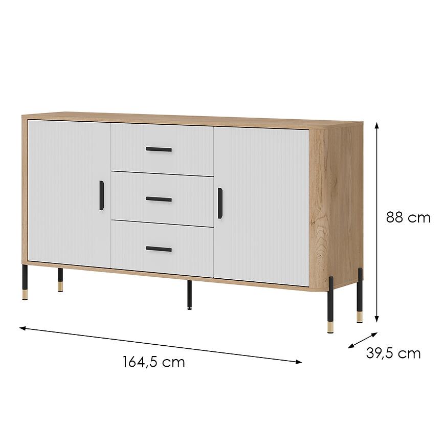 Komoda ma szerokość 164,5 cm, wysokość 88 cm oraz głębokość 39,5 cm, co zapewnia dużą przestrzeń do przechowywania. Model posiada dwa drzwi oraz trzy szuflady, umożliwiając wygodne przechowywanie tekstyliów, dokumentów, dekoracji i innych przedmiotów, utrzymując wnętrze w porządku.