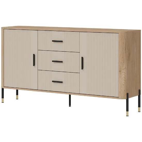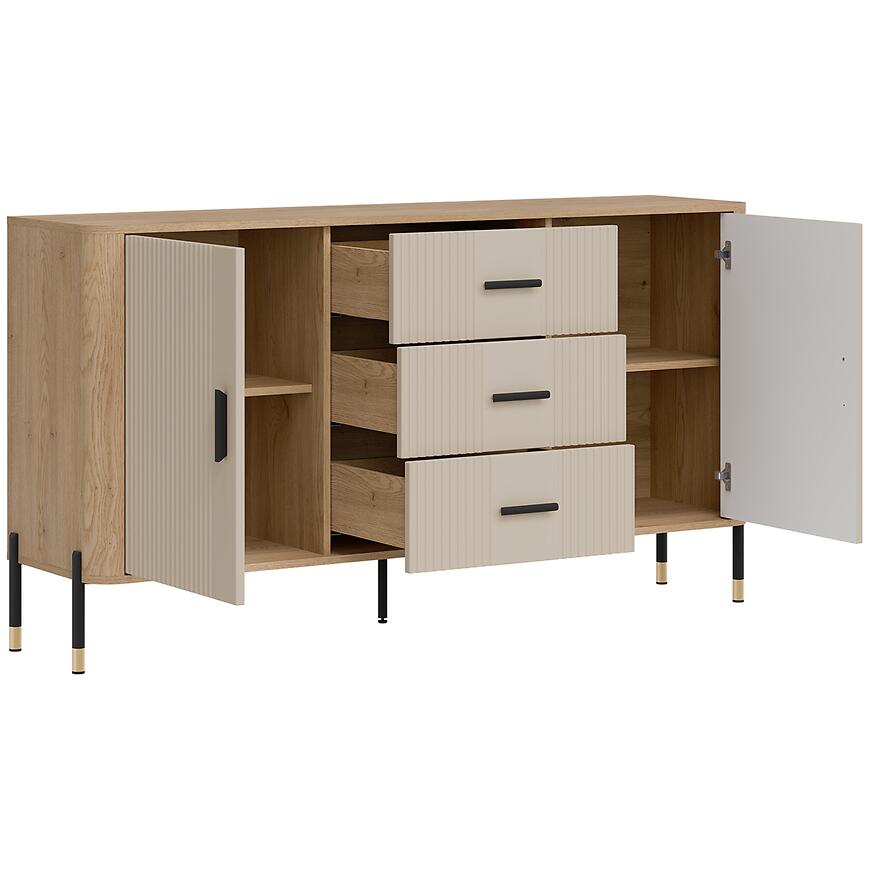 Komoda ma szerokość 164,5 cm, wysokość 88 cm oraz głębokość 39,5 cm, co zapewnia przestronną powierzchnię do przechowywania. Model posiada dwa drzwi i trzy szuflady, umożliwiając wygodne przechowywanie tekstyliów, dokumentów, dekoracji i innych akcesoriów, utrzymując wnętrze w porządku.