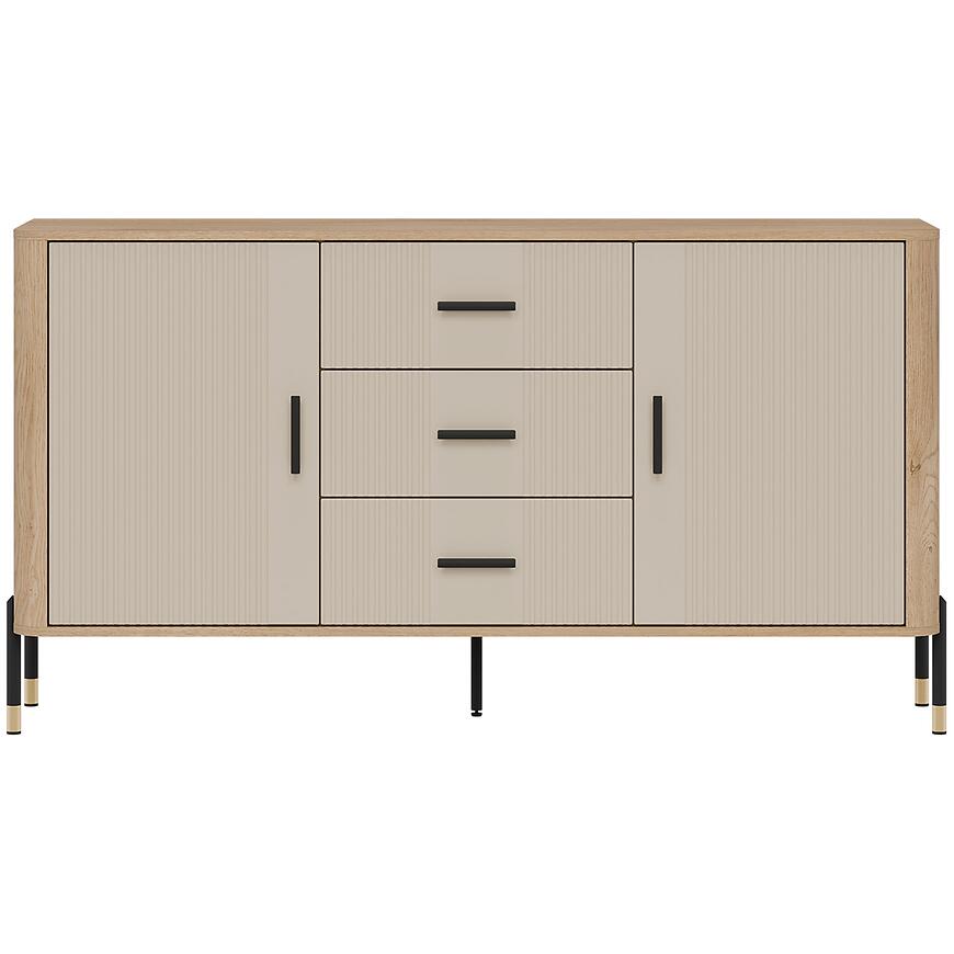 Komoda Dante Dt06 Dąb Cremona/Kaszmir to stylowy mebel, który łączy nowoczesny design z praktyczną przestrzenią do przechowywania. Dwudrzwiowe fronty w kolorze kaszmir zestawiono z jasnym korpusem w odcieniu dąb Cremona, tworząc harmonijną i elegancką kompozycję, idealną do salonów, jadalni oraz pokojów dziennych. Opcjonalne oświetlenie LED podkreśla charakter mebla i wprowadza przytulną atmosferę we wnętrzu.