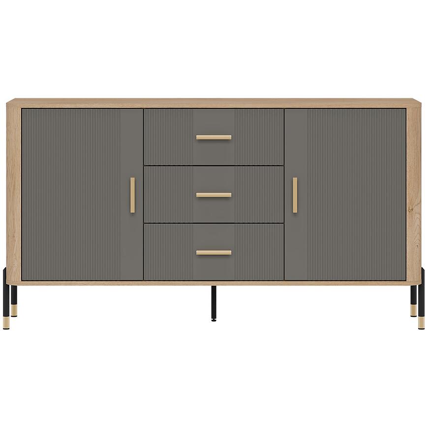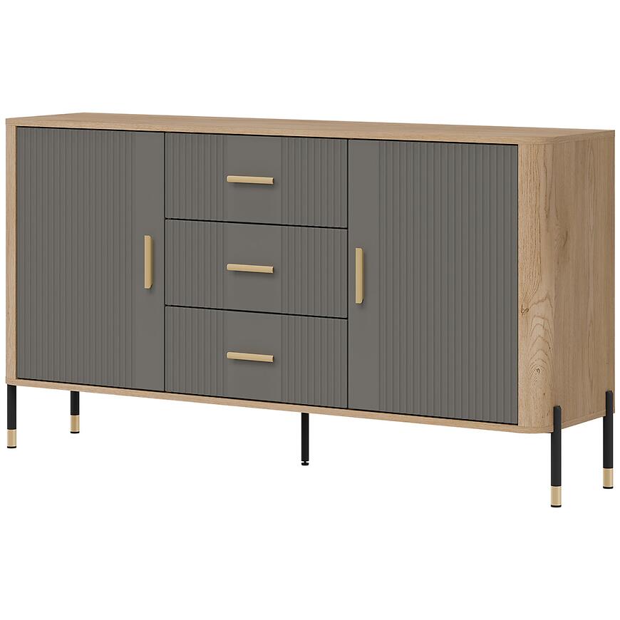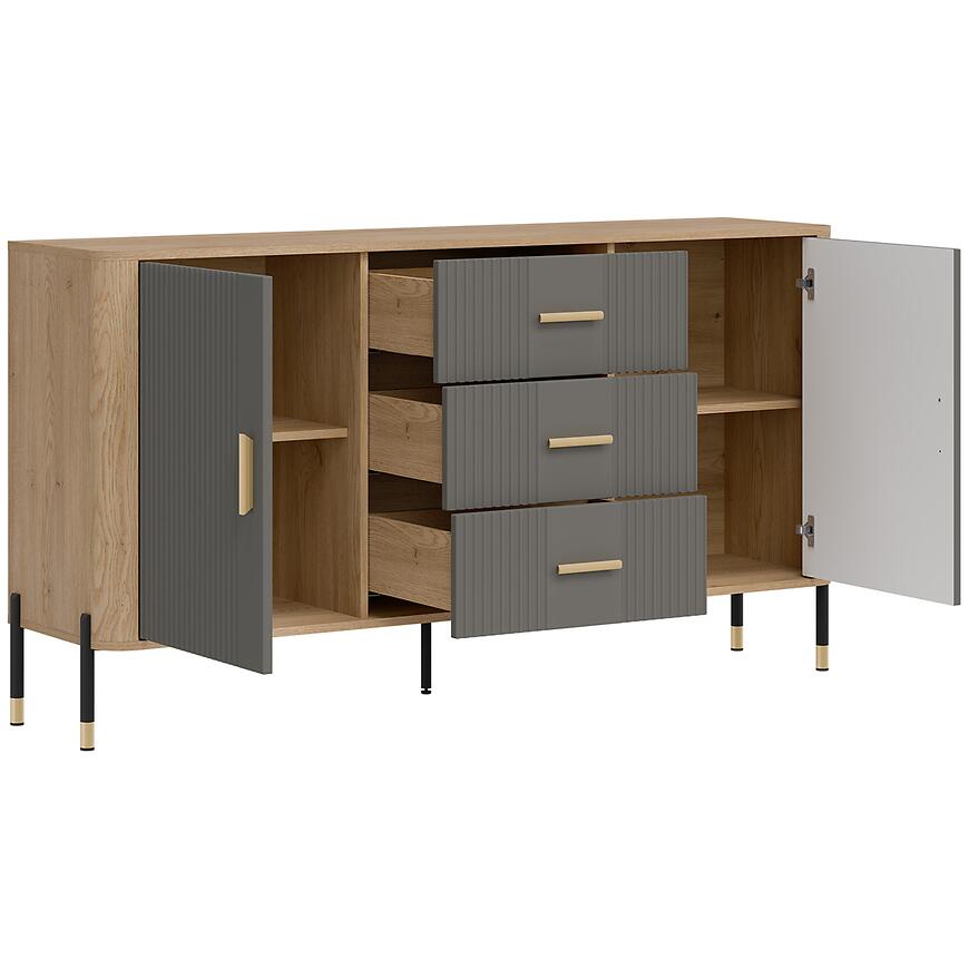 Komoda ma szerokość 164,5 cm, wysokość 88 cm oraz głębokość 39,5 cm, oferując przestrzeń do przechowywania różnych przedmiotów. Model posiada dwa drzwi i trzy szuflady, umożliwiając wygodne przechowywanie tekstyliów, dokumentów, dekoracji oraz innych akcesoriów, utrzymując wnętrze w porządku.